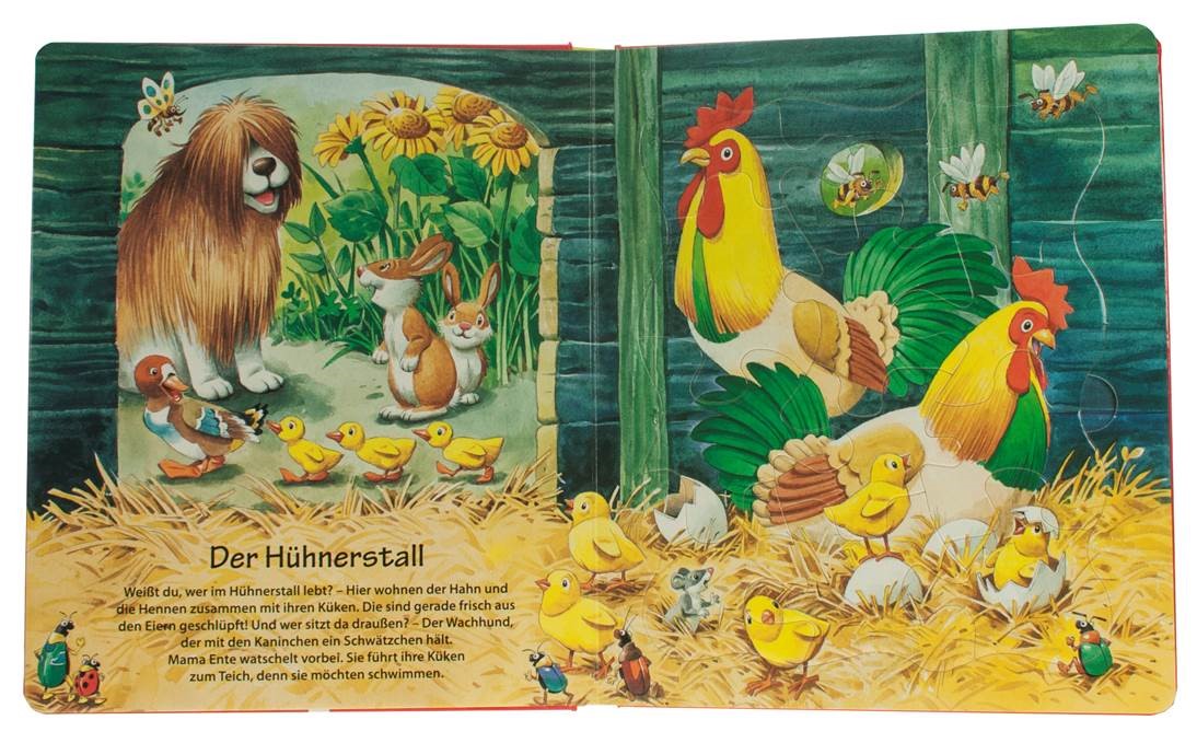 | Schlagworte | Bauernhof • Bauernhof; Bilderbuch • Bauernhof; Sachbilderbuch • Bilderbücher mit Erzähltexten • Hühner • Interaktive Bücher, Mitmachbücher • Kinderpuzzles (Nonbooks) • Kuh • Papp-Bilderbuch • Pferd • Puzzle • Puzzlebuch • Stall |