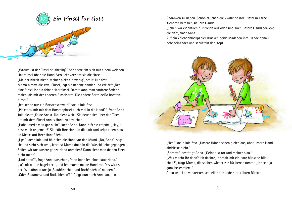 25 tolle Geschichten mit den fünfjährigen Zwillingsschwestern Anna und Jule zum Vorlesen! Die beiden Mädchen haben es schon faustdick hinter den Ohren, spielen gerne Streiche oder denken sich ganz verrückte Sachen aus. Sie legen Kochtöpfe in Papas Bett oder verstecken im Sommer Ostereier! So gibt es beim Vorlesen der lustigen und spannenden Geschichten immer was zu Lachen - und auch immer einen klugen Lerneffekt über Gott und die Bibel am Ende jeder Geschichte. Denn dann greifen Papa und Mama der Zwillinge immer etwas aus dem Erlebten auf und erzählen dazu eine interessante Begebenheit aus der Bibel oder etwas Wichtiges über Gott!