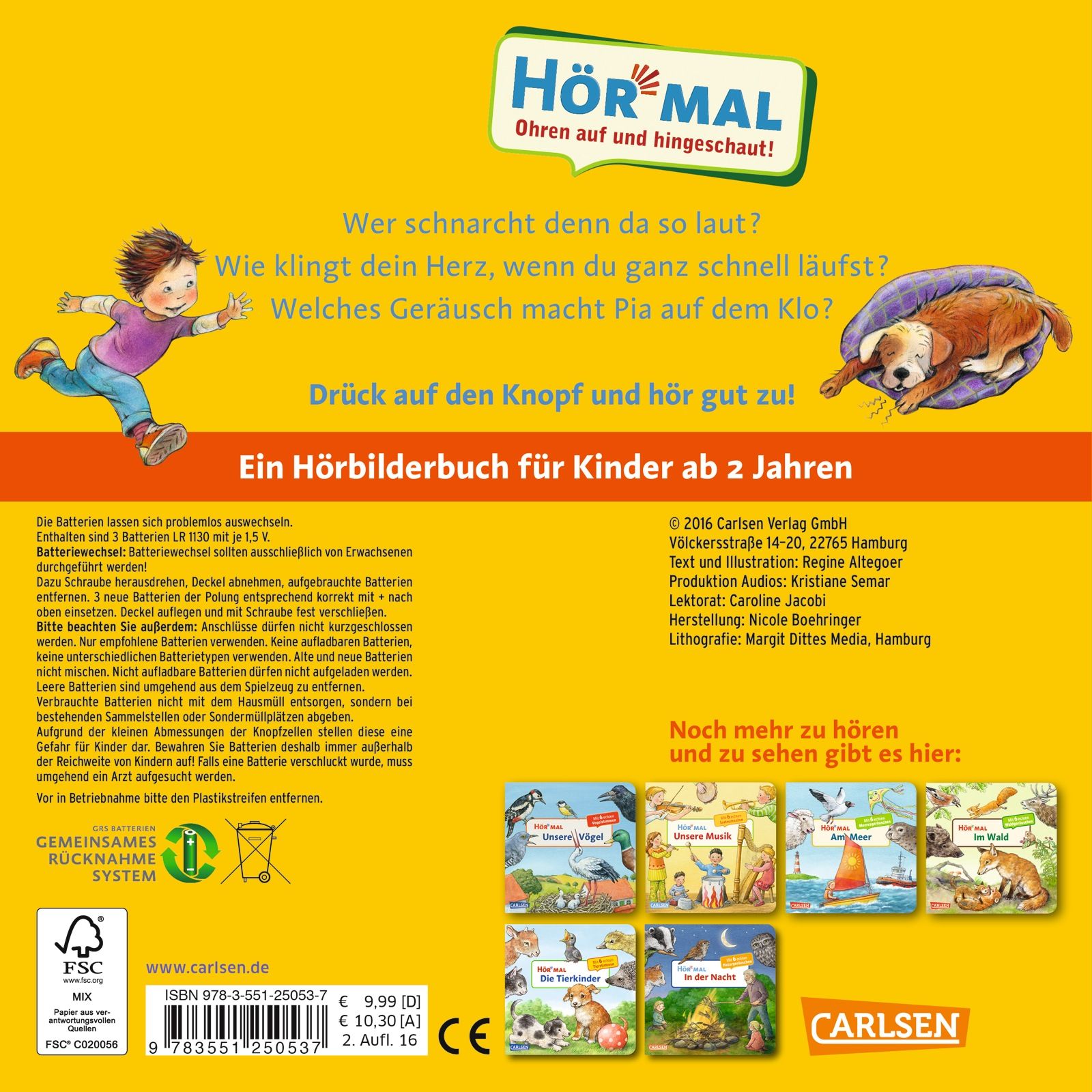 Typisch Hör mal: Jedes Buch enthält 6 leicht auslösbare Sounds mit einer Gesamtspielzeit von 60 Sekunden. Durch Druck auf die farbig markierten Punkte auf jeder Doppelseite werden die Geräusche aktiviert und deaktiviert. Kinder ab 2 Jahren können die Bücher problemlos alleine bedienen, bei jüngeren Kindern sollten die Eltern die Soundbuttons drücken, da die Feinmotorik und Kraft der kleinen Finger noch nicht ausreicht. Alle Titel der Reihe unterliegen strengen Sicherheitsanforderungen und Qualitätskontrollen. Jeder Soundknopf wird vor der Auslieferung auf seine Funktionsfähigkeit geprüft. Die Lautstärke der Sounds entspricht den Vorgaben der europäischen Spielzeugrichtlinie. Ausgeliefert werden die Bücher mit 3 handelsüblichen Knopfzell-Batterien LR 1130 mit je 1,5 V. Die Batterien lassen sich problemlos auswechseln. Dies ist zum Beispiel der Fall, wenn die Sounds nicht mehr die volle Spielzeit haben oder sich nur noch schwer auslösen lassen.