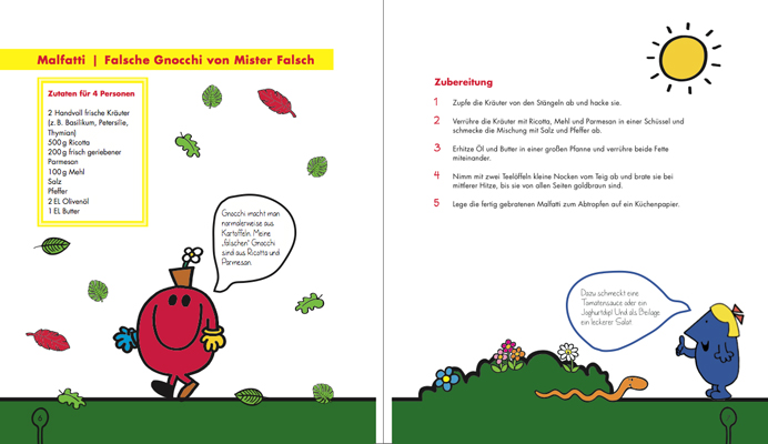 Essen ist immer wieder kurioses Thema in den verschiedenen Mr. Men Little Miss- Bändchen: Mister Muskel isst den ganzen Tag nur Eier, Miss Vielfraß kann 66 Würstchen auf einmal verputzen und Miss Prinzessin lässt sich Pizza vom Lieferservice bringen. Auch in jeder Familie ist Essen und seine Zubereitung ein täglich wiederkehrendes Thema. So haben wir ein alltagstaugliches kunterbuntes Kochbuch kreiert, das den Mister Men und Little Misses bestimmt auch gefallen würden: Es gibt Mango-Curry so gelb wie Mister Glücklich, Müsli mit Mister Krach, Cupcakes mit Miss Knuddel und Eistee mit Miss Sonnenschein. Einige Rezepte sind sehr einfach gehalten und können von Kindern ab dem Vorschulalter auch schon alleine bewältigt werden, andere sind etwas komplizierter und sollten mit einem Erwachsenen zusammen nachgekocht werden. Viel Spaß beim Kochen mit Mister Glücklich und seinen Freunden!
