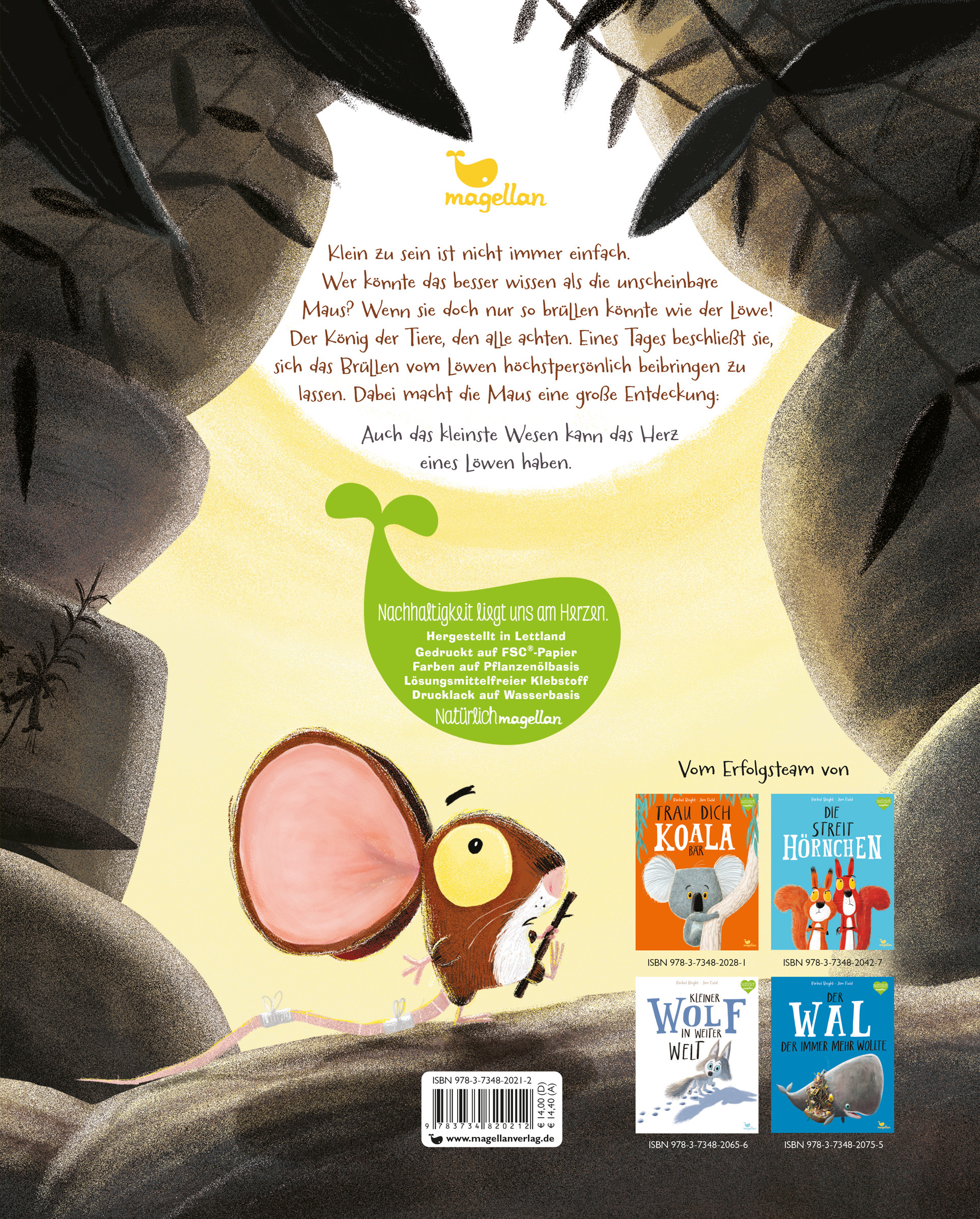 Klein zu sein ist nicht immer einfach. Wer könnte das besser wissen als die Maus? Man wird vergessen, übersehen und geschubst. Doch eines Tages hat die Maus die Nase voll! Wenn sie doch nur so brüllen könnte wie der Löwe, dann würde ihr das nicht mehr passieren! Sie fasst all ihren Mut zusammen und beschließt, den mächtigen Löwen zu besuchen. Denn wer könnte ihr das Brüllen besser beibringen als der Löwe höchstpersönlich? Am Ende ihrer abenteuerlichen Reise macht die Maus eine Entdeckung: Man muss gar nicht groß und stark sein, um seine eigene Stimme zu finden.