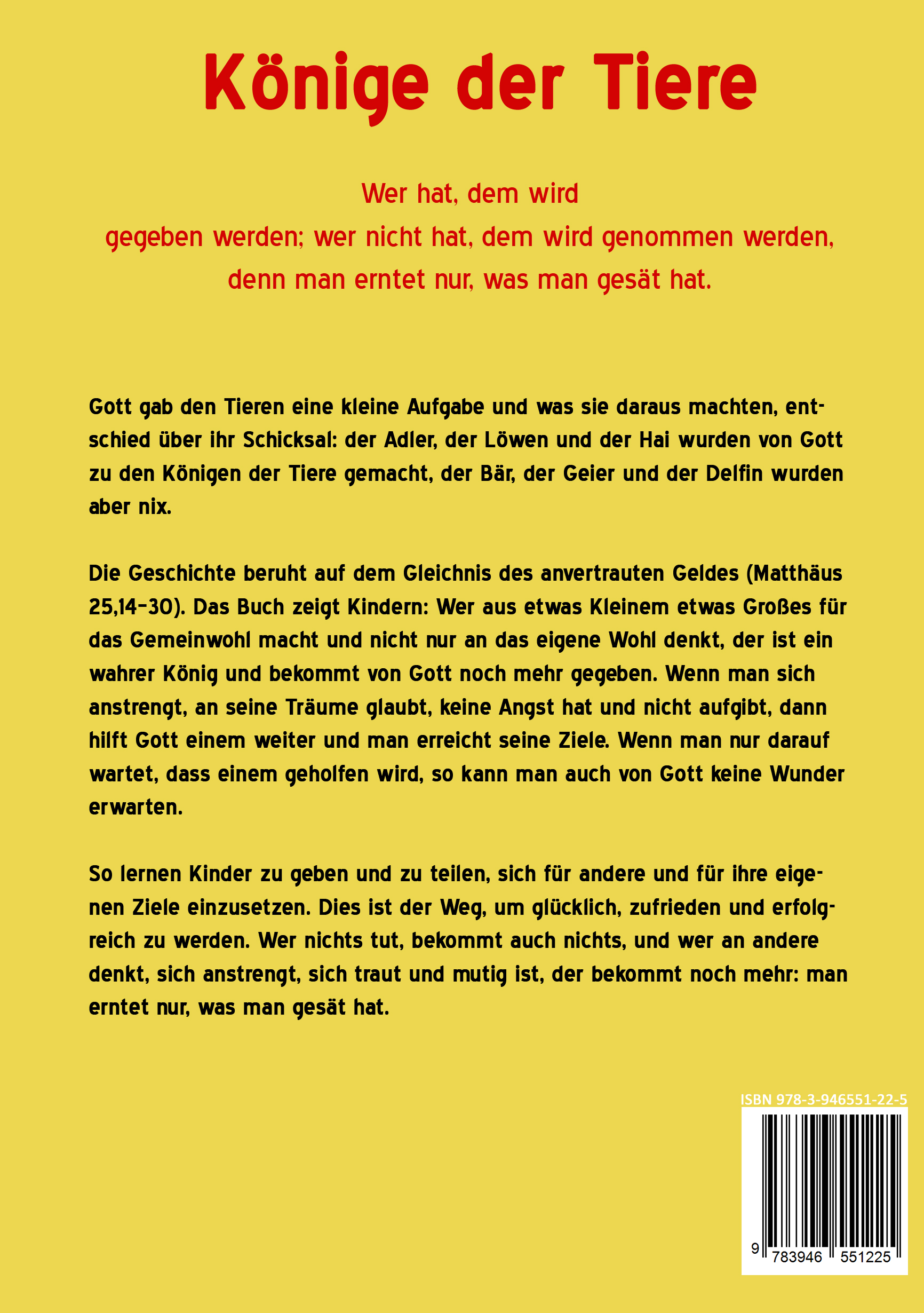 Früher lebten die Dinosaurier friedlich auf der Erde und alle waren vor Gott gleich. Doch dann ließ Gott sie eine Weile alleine, forderte aber von ihnen, dass sie sich lieben, nicht streiten, nicht schlagen, nicht gegenseitig fressen und sich immer gegenseitig verzeihen sollten.Als er nach vielen Jahren wiederkam, fand er nur noch sich streitende und unversöhnliche Dinosaurier vor, sie hatten auch angefangen, sich gegenseitig zu fressen. Gott war sehr wütend und schickte einen großen Meteoriten, um alles auszulöschen und neu anzufangen.Diese Mal erschuf er viele verschiedene Tiere in der Luft, im Wasser und auf dem Land. Damit es nicht wieder zu solch Streitigkeiten wie bei den Dinos kommen würde, wollte er, dass die Tiere einen König bestimmen, der darüber wachen würde, dass Gottes Regeln eingehalten werden, wenn er nicht da sei. Die Tiere konnten sich nicht auf ein Tier einigen und so beschloss Gott, dass es einen König für die Landtiere, einen für die Wassertiere und einen für die Lufttiere geben sollte. Zwei Vertretern jeder Gruppe gab er eine Aufgabe und zog sich zurück um sich auszuruhen.Als er wiederkam, rief er die Vertreter zu sich und ließ sich zeigen, wie sie die Aufgabe bewältigt hatten. Dann fiel es ihm leicht, zu entscheiden, wer der König der Tiere auf dem Land, der König der Tiere im Wasser und der König der Tiere in der Luft werden sollte.Die Geschichte beruht auf dem Gleichnis des anvertrauten Geldes (Matthäus 25,14-30). Das Buch zeigt Kindern: Wer aus etwas Kleinem etwas Großes für das Gemeinwohl macht und nicht nur an das eigene Wohl denkt, der ist ein wahrer König und bekommt von Gott noch mehr gegeben. Wenn man sich anstrengt, an seine Träume glaubt, keine Angst hat und nicht aufgibt, dann hilft Gott einem weiter und man erreicht seine Ziele. Wenn man nur darauf wartet, dass einem geholfen wird, so kann man auch von Gott keine Wunder erwarten.So lernen Kinder zu geben und zu teilen, sich für andere und für ihre eigenen Ziele einzusetzen. Dies ist der Weg, um glücklich, zufrieden und erfolgreich zu werden. Wer nichts tut, bekommt auch nichts, und wer an andere denkt, sich anstrengt, sich traut und mutig ist, der bekommt noch mehr: man erntet nur, was man gesät hat.