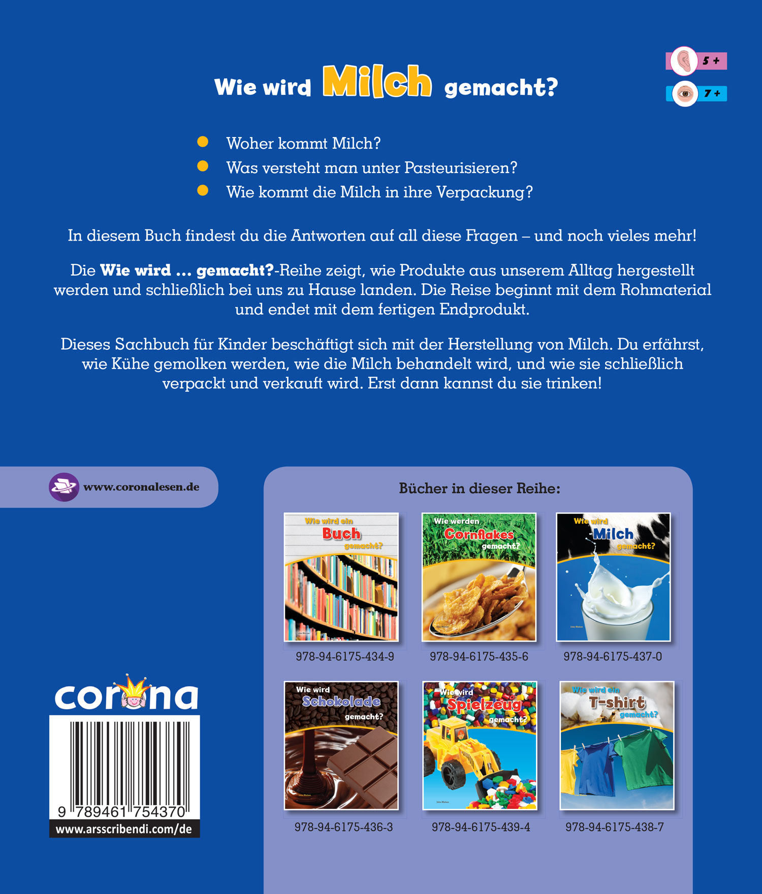 Die Wie wird ... gemacht?-Reihe zeigt, wie Produkte aus unserem Alltag hergestellt werden und schließlich bei uns zu Hause landen. Die Reise beginnt mit dem Rohmaterial und endet mit dem fertigen Endprodukt.Dieses Sachbuch für Kinder beschäftigt sich mit der Herstellung von Milch. Du erfährst, wie Kühe gemolken werden, wie die Milch behandelt wird, und wie sie schließlich verpackt und verkauft wird. Erst dann kannst du sie trinken!