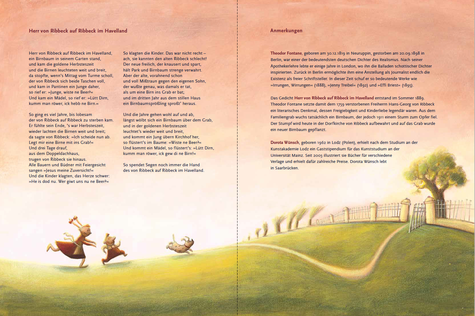 | Schlagworte | Antolin (3. Klasse) • Ballade • Birnbaum • Birnen • Dorota Wünsch • Fontane • Havelland • Herbst • Herr von Ribbeck • Kinder, Jugendliche und Bildung • Kinderreime; Bilderbuch • Neuruppin • Ribbeck • Theodor Fontane • Wünsch |