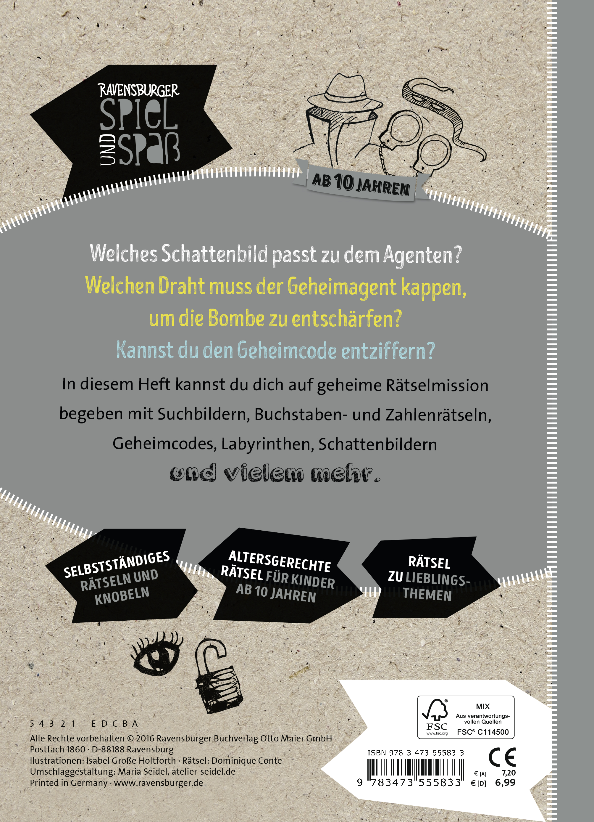 | Schlagworte | Agenten-Rätsel • altersgerechte Rätsel • Beschäftigung • Denkspaß • Ferien • Geschenk für Kinder • Grundschule • Knobeln • Quiz • Rätsel • Rätsel f. Kinder/Jugendliche • Rätselspaß • Ravensburger • Spiel und Spaß • Unterwegs |