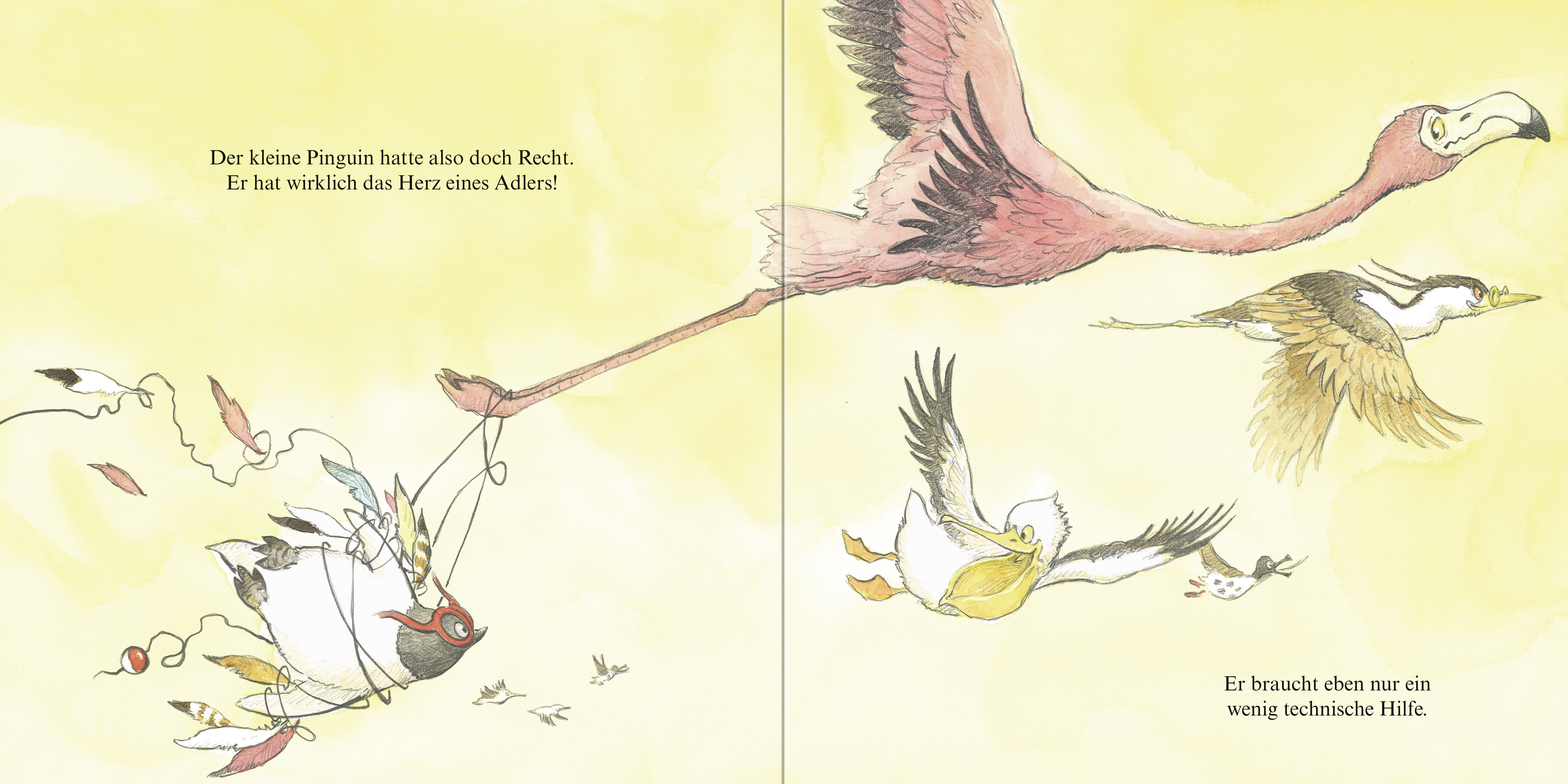 Trotz vieler Flugstunden und großem Willen kann der kleine Pinguin nicht fliegen. Ob er dafür einfach nicht gemacht ist? Obwohl er doch das Herz eines Adlers hat! Erst als der freundliche Fluglehrer ihm ein wenig unter die Flügel greift, geht der Traum vom Fliegen doch noch in Erfüllung. Eine liebevolle Geschichte über die Kraft der Freundschaft und darüber, dass Beharrlichkeit irgendwann belohnt wird.