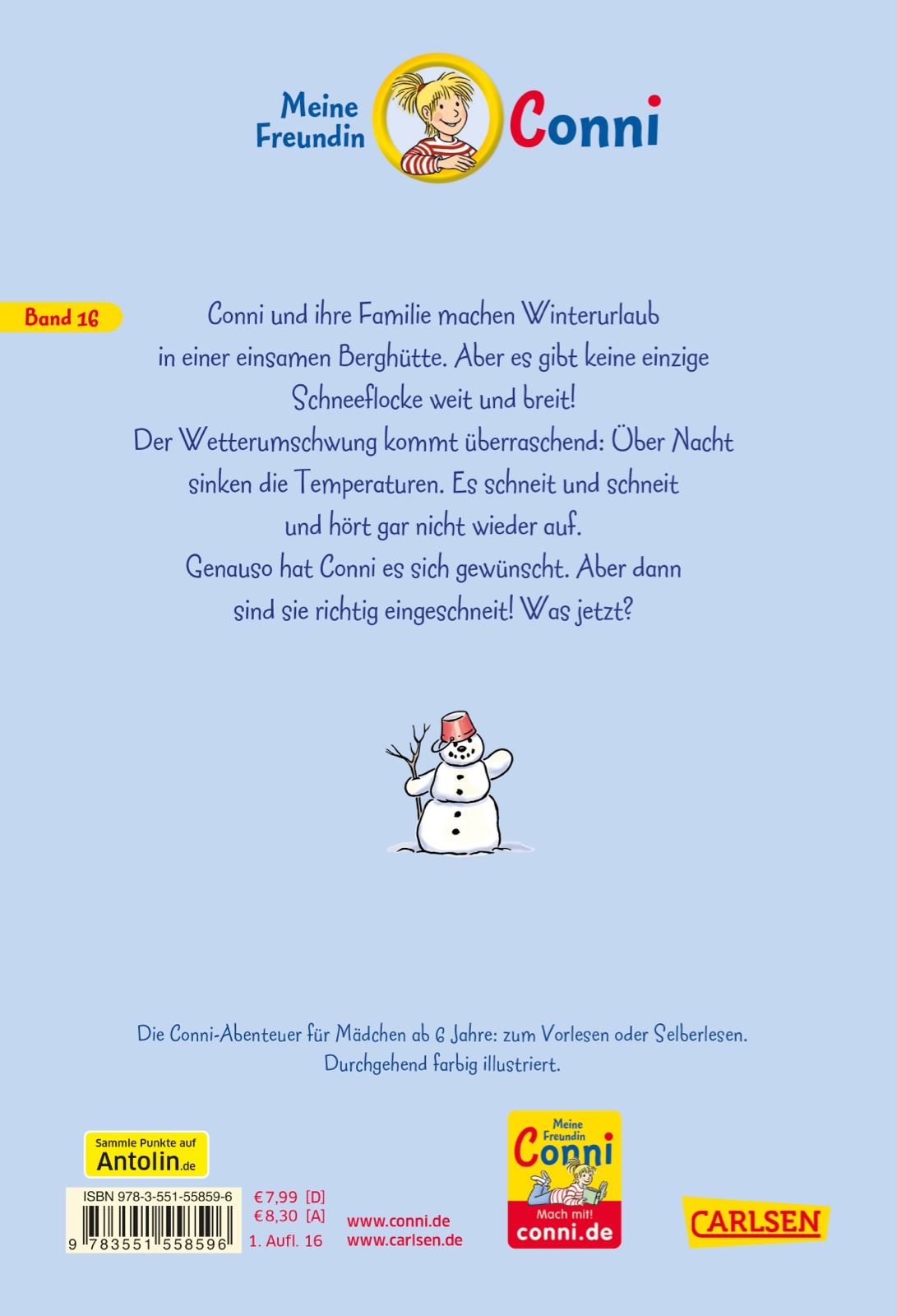 Der beliebte Conni-Erzählband jetzt mit farbigen Illustrationen! Conni und ihre Familie machen Winterurlaub in einer kleinen einsamen Berghütte. Aber dieses Jahr scheint es gar keinen richtigen Winter zu geben: Keine einzige Schneeflocke weit und breit! Der Wetterumschwung kommt überraschend: Über Nacht sinken die Temperaturen. Es schneit und schneit und hört gar nicht mehr wieder auf. Sie sind richtig eingeschneit! Was jetzt?