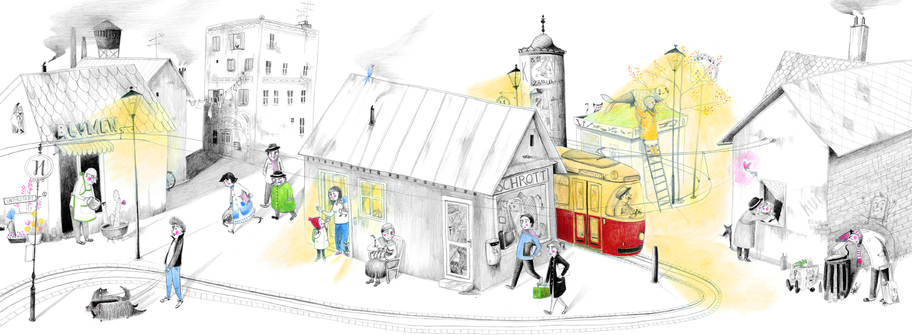 Einsteigen und Mitfahren! Ohne Worte führt uns Julie Völk in kunstvoll-detailreichen Bildern mit der kleinen Straßenbahn durch die große Stadt.