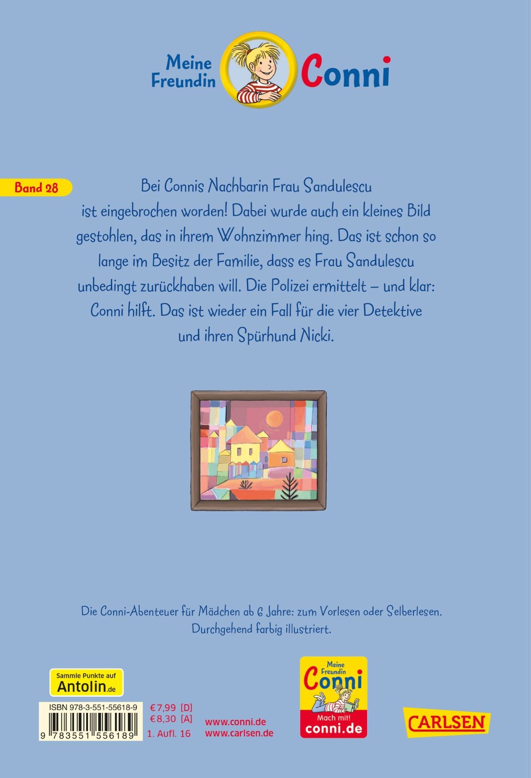 Bei Connis Nachbarin Frau Sandulescu ist eingebrochen worden! Viel gestohlen wurde nicht - aber unter anderem auch ein kleines Bild, das in ihrem Wohnzimmer hing. Das ist schon so lange im Besitz der Familie, dass es Frau Sandulescu unbedingt zurückhaben will. Die Polizei ermittelt - und klar: Conni hilft. Das ist wieder ein Fall für die vier Detektive und ihren Spürhund Nicki. Sie müssen das Bild finden!