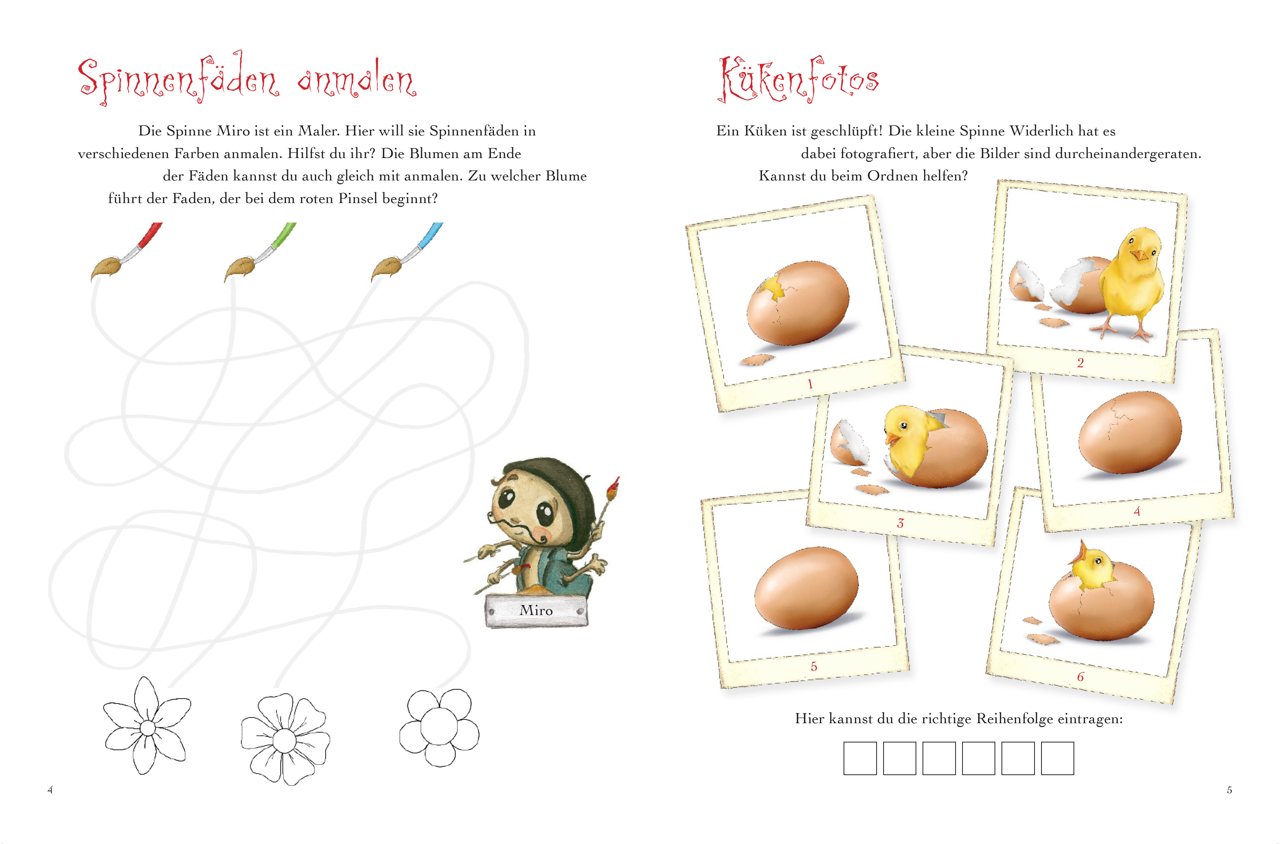 Die kleine Spinne Widerlich kann überall ihr Netz spannen, wo auch immer es ihr gefällt. Und so reist sie fröhlich durch die Welt und besucht eines Tages einen Bauernhof. Auf dem gibt es so viel Spannendes zu entdecken!In diesem liebevoll gestalteten Mitmachbuch können Kinder zusammen mit der kleine Spinne den Bauernhof erkunden, mit sieben frechen Küken Versteck spielen, Tierspuren im Matsch erraten, dem Hofpferd Paula die Mähne flechten, Sticker einkleben, tolle Schachtelspinnen bauen, ein Bauernhof-Karten-Spiel selber basteln und noch vieles mehr ......