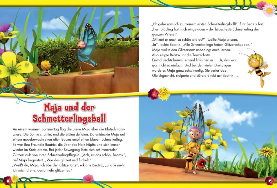 Maja und Willi sind honigdicke Freunde. Rund um die Klatschmohnwiese und den Seerosenteich erleben sie viele lustige und spannende Abenteuer. Mal helfen sie einem verzweifelten Schmetterling, dessen erster Schmetterlingsball beinahe ins Wasser gefallen wäre – mal bringen sie einem unmusikalischen Grashüpfer bei, wie man sein Publikum begeistert. Und am Ende retten Maja und Willi mit ihrem Spezialrezept für den königlichen Kuchen den gesamten Bienenstock! Kleine Biene Maja-Fans können in diesem liebevoll gestalteten Buch ganz in die Welt der Klatschmohnwiese eintauchen und noch einmal die schönsten Geschichten miterleben. Und als Special gibt es eine DVD mit drei weiteren aufregenden Abenteuern.