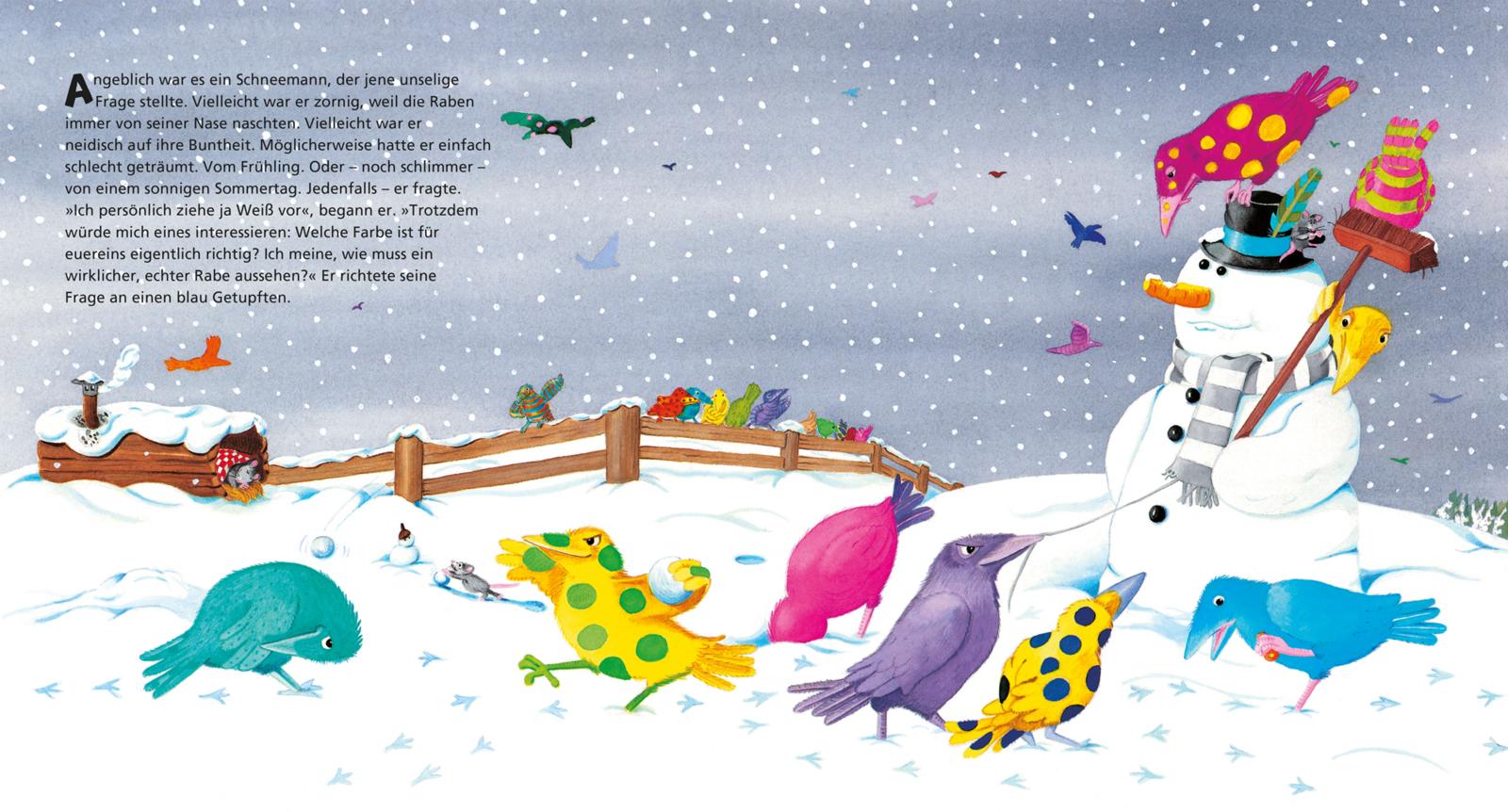 Früher sahen die Raben prächtig aus, zum Beispiel rosa mit violetten Schwanzfedern. Oder gelb mit großen grünen Tupfen. Oder hellblau mit zarten orangeroten Streifen - geradezu kunterbunt.Doch sie stritten sich dauernd, denn jeder behauptete, der Schönste zu sein. Da passierte eines Tages etwas Unerwartetes, das die Welt der Raben völlig auf den Kopf stellte ...