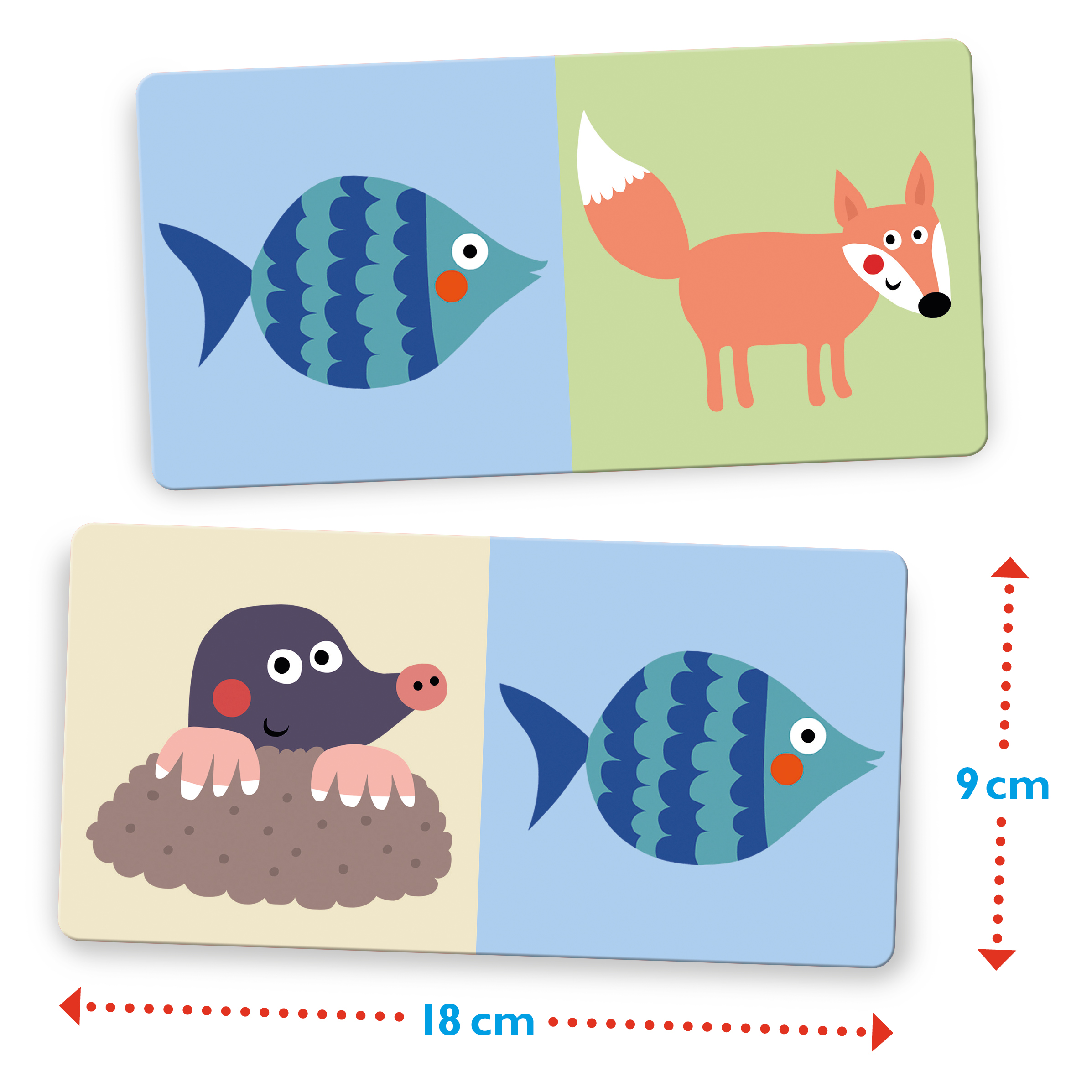 Kann die Eule an den Fuchs angelegt werden? Wo findet der Fisch seinen Platz? Und an welche Stelle passen Schwein und Maulwurf am besten?Bei dem Spieleklassiker ist Kombinationsgeschick gefragt. Wer als Erster alle seine Dominokarten angelegt hat, gewinnt!