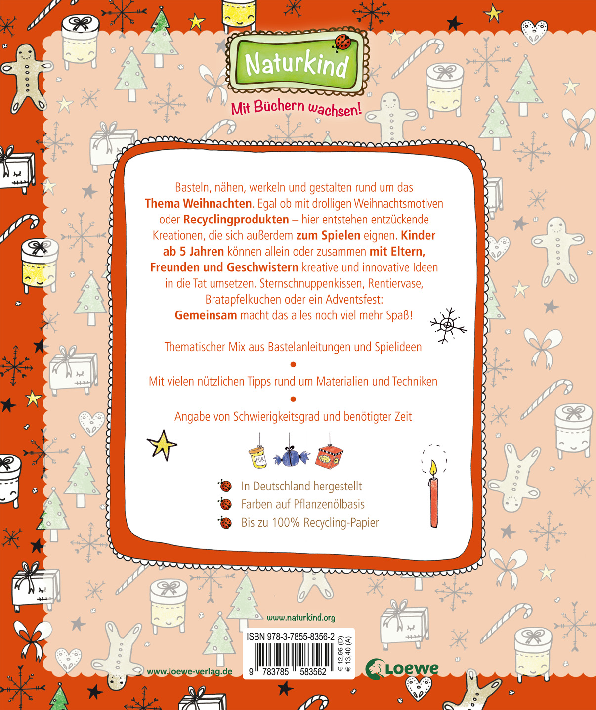 Gemeinsam kreativ sein anhand von ökologischen Bastel- und Spielideen! Gebastelt wird ganz im Sinne der Naturkind-Reihe mit Recyclingprodukten. Dieses Buch ist weitaus mehr als ein gewöhnliches Bastelbuch für Kinder ab 5 Jahren, auch aufgrund der pfiffigen Illustrationen des Designer-Duos Herr Pfeffer! Die erfahrenen Autorinnen veranstalten selbst Workshops (www.herrpfeffer.de) und leben vom Kreativsein, u. a. sind ihre Produkte auf DaWanda erhältlich. Ein ideales Geschenk für alle Bastel- und Weihnachtsfreunde!
