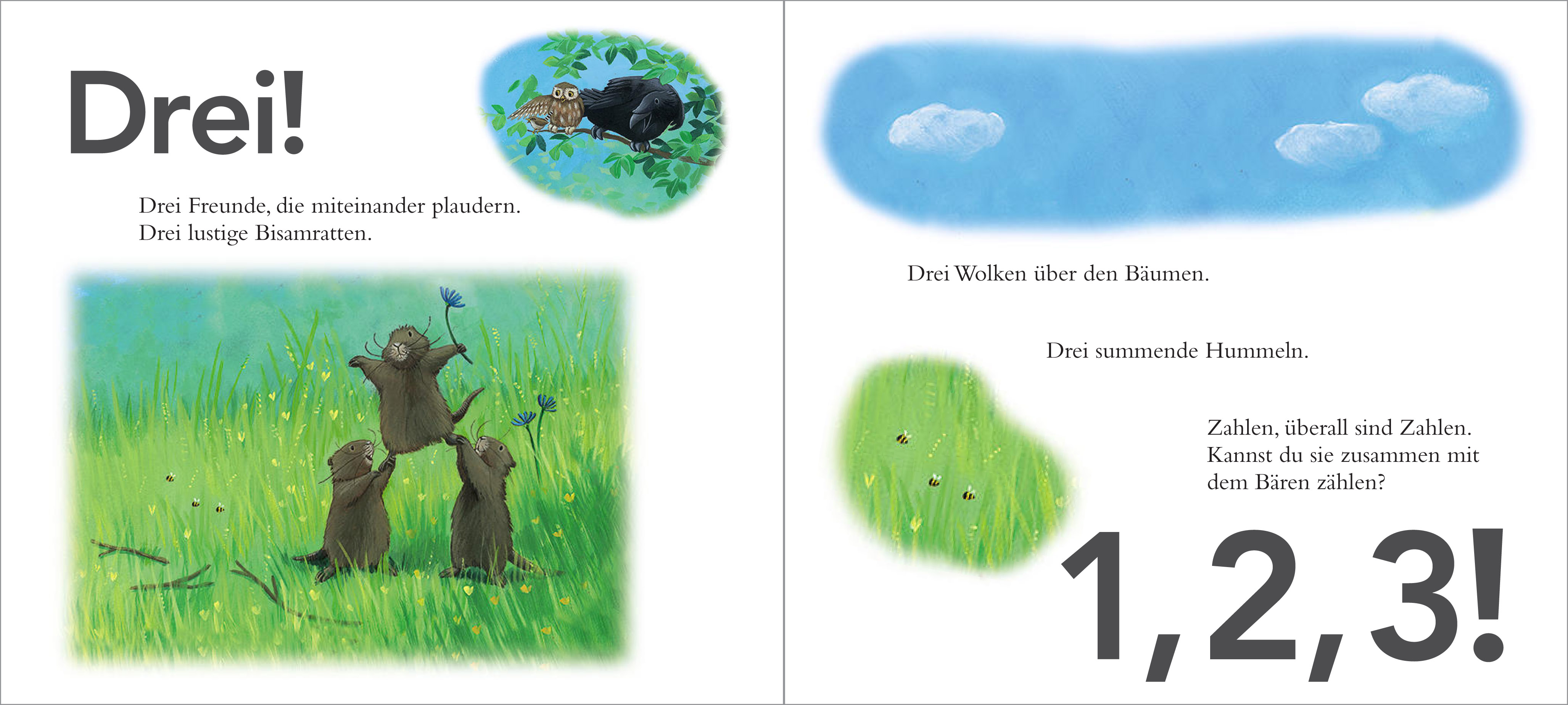 Der Bär und seine Freunde genießen einen sonnigen Morgen und der Bär zählt eifrig, was immer er entdeckt. Hoch oben am Himmel fliegt eine Libelle, der Hase bringt zwei Äpfel vorbei, drei Hummeln summen durch das Gras, vier Frösche hüpfen quakend umher und fünf Entenküken schwimmen im Wasser. 1, 2, 3, 4, 5! Kannst du zusammen mit dem Bären zählen?