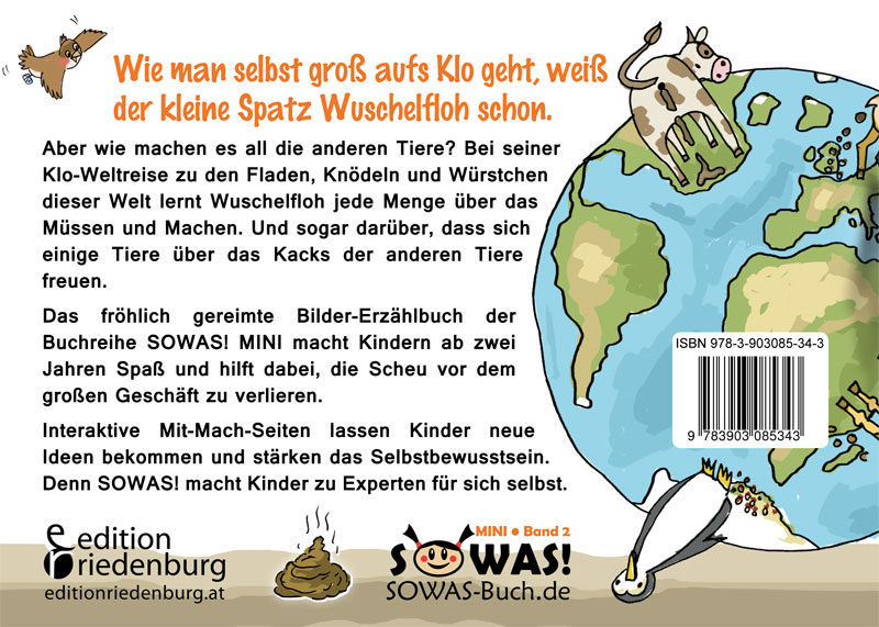 Kennst du ihn noch, den Wuschelfloh? Der ist jetzt ohne Windel froh. Er flattert hin und flattert her, die Windelhose drückt nicht mehr. Schon längst hat unser Floh entdeckt, was unterm Spatzenkloloch steckt: Ein weißgelbbrauner Kackasee – niemals verirrt sich dort ein Reh. „Wohin geh‘n all die Tiere bloß, wenn ihr Geschäft ist riesengroß?“ Das fragt der Floh beim Würmerschmaus, und Mama zwitschert laut hinaus: „Sie gehen da und dort und drüben und lassen es für Fliegen liegen. Summ summ, brumm brumm, dideldumm dideldumm.“ Der Wuschel schüttelt stark den Kopf und zeigt auf einen alten Topf: „Ich glaub nicht, dass das wirklich stimmt. Manch einer doch ein Töpfchen nimmt.“ Und weil’s Mama nicht sicher weiß, sie trällert nach der Würmerspeis: „So lass auf Exkursion uns geh‘n und nach den Tiertoiletten seh‘n.“