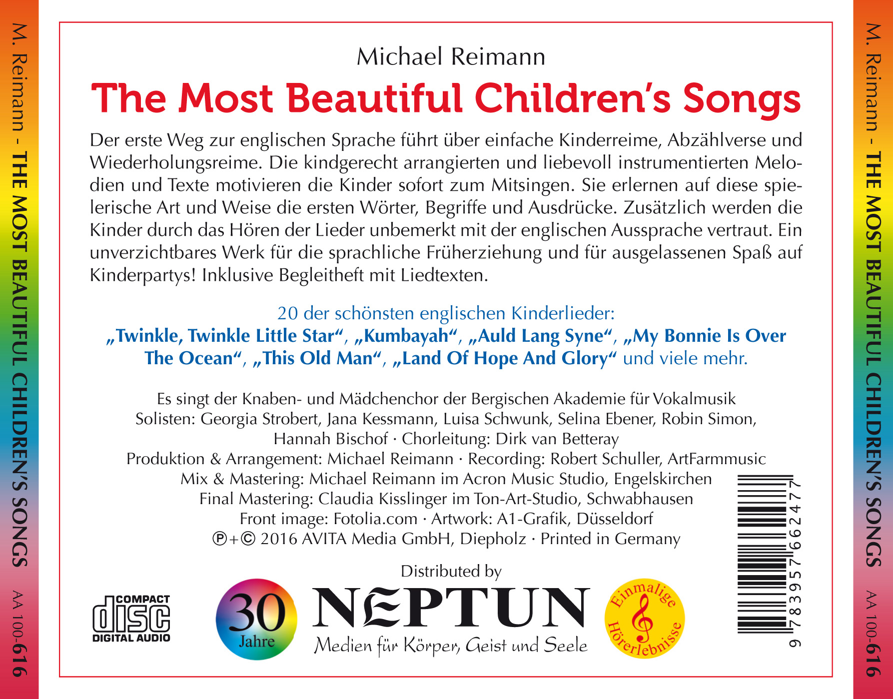 Der erste Weg zur englischen Sprache führt über einfache Kinderreime, Abzählverse und Wiederholungsreime. Die kindgerecht arrangierten und liebevoll instrumentierten Melodien und Texte motivieren die Kinder sofort zum Mitsingen. Sie erlernen auf diese spielerische Art und Weise die ersten Wörter, Begriffe und Ausdrücke. Zusätzlich werden die Kinder durch das Hören der Lieder unbemerkt mit der englischen Aussprache vertraut. Ein unverzichtbares Werk für die sprachliche Früherziehung und für ausgelassenen Spaß auf Kinderpartys! – inkl. Begleitheft mit Liedtexten.