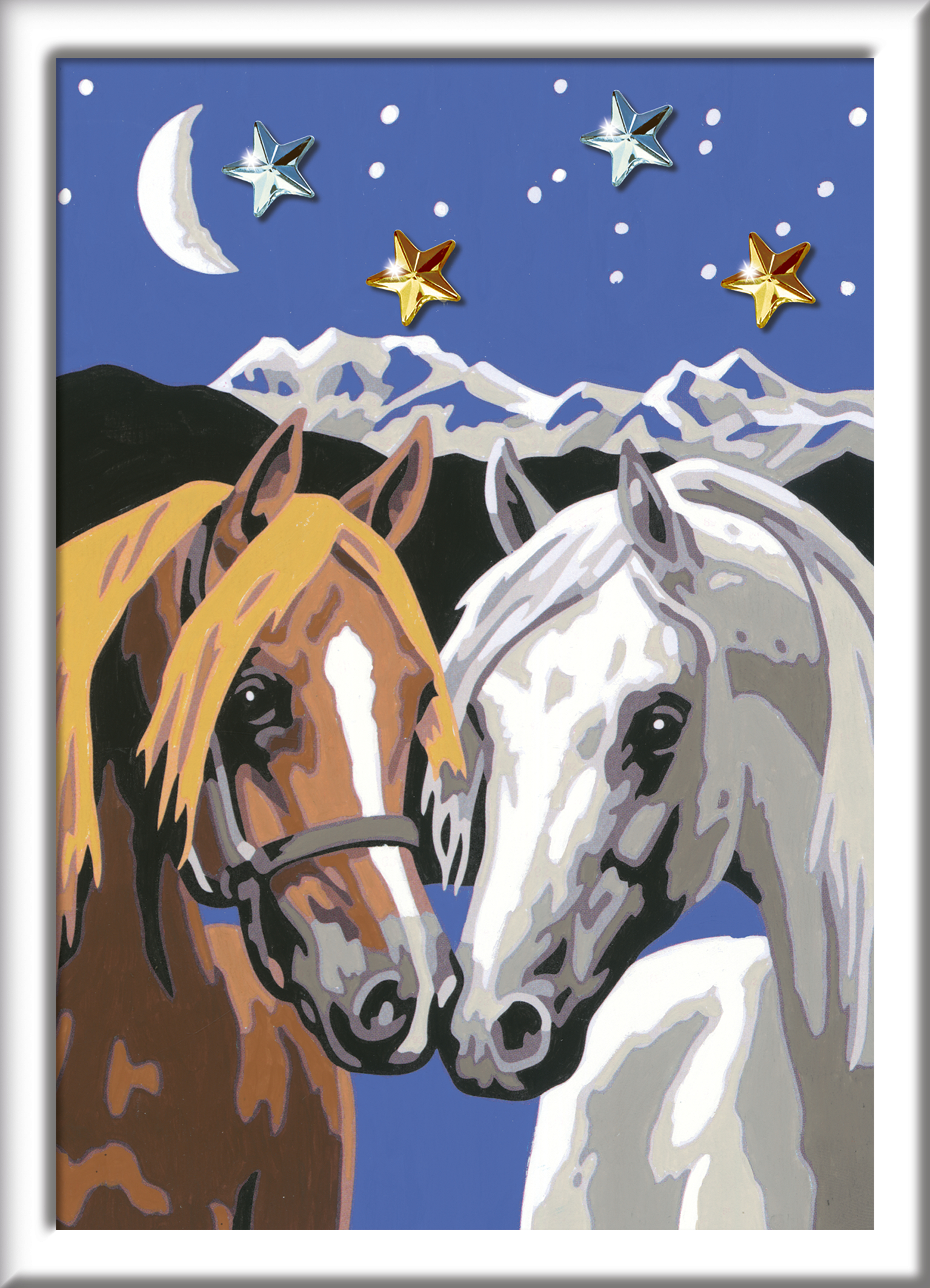 Jedes Malset enthält alles, was Künstler zum Malen brauchen und es ist kein Mischen der Farben notwendig. Zusätzlich zur Maltafel, zu den Farben und zum Pinsel, sind in diesem Malset funkelnde Glitzer Steine enthalten. Mit ihnen wird das fertig gemalte Bild verziert und zum Strahlen gebracht.