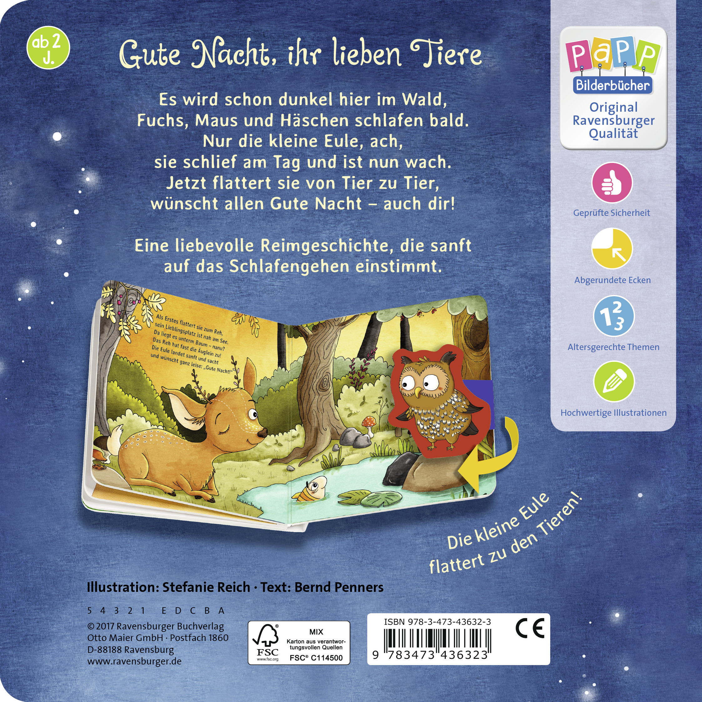 Abends, wenn es dunkel wird, flattert die Eule von Tier zu Tier und wünscht allen eine gute Nacht. Die gereimte Geschichte wird ergänzt durch eine am Buch befestigte Stoffeule, die auf jeder Seite kinderleicht ins Buch geklappt werden kann.