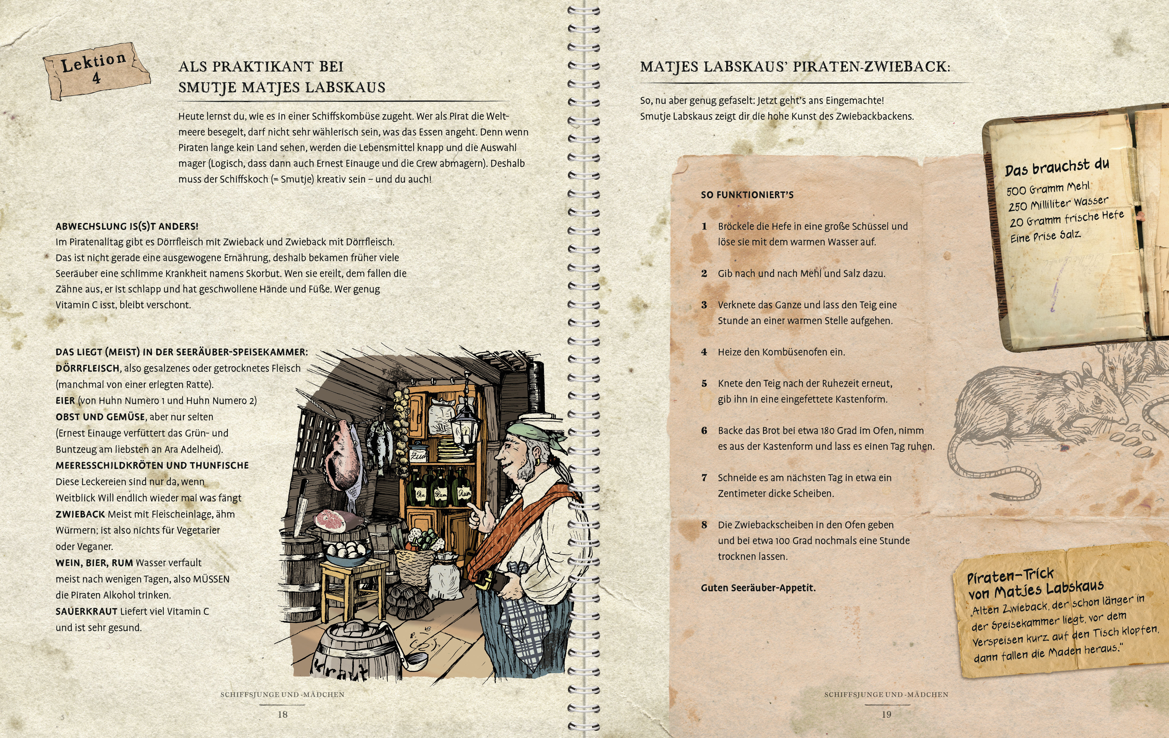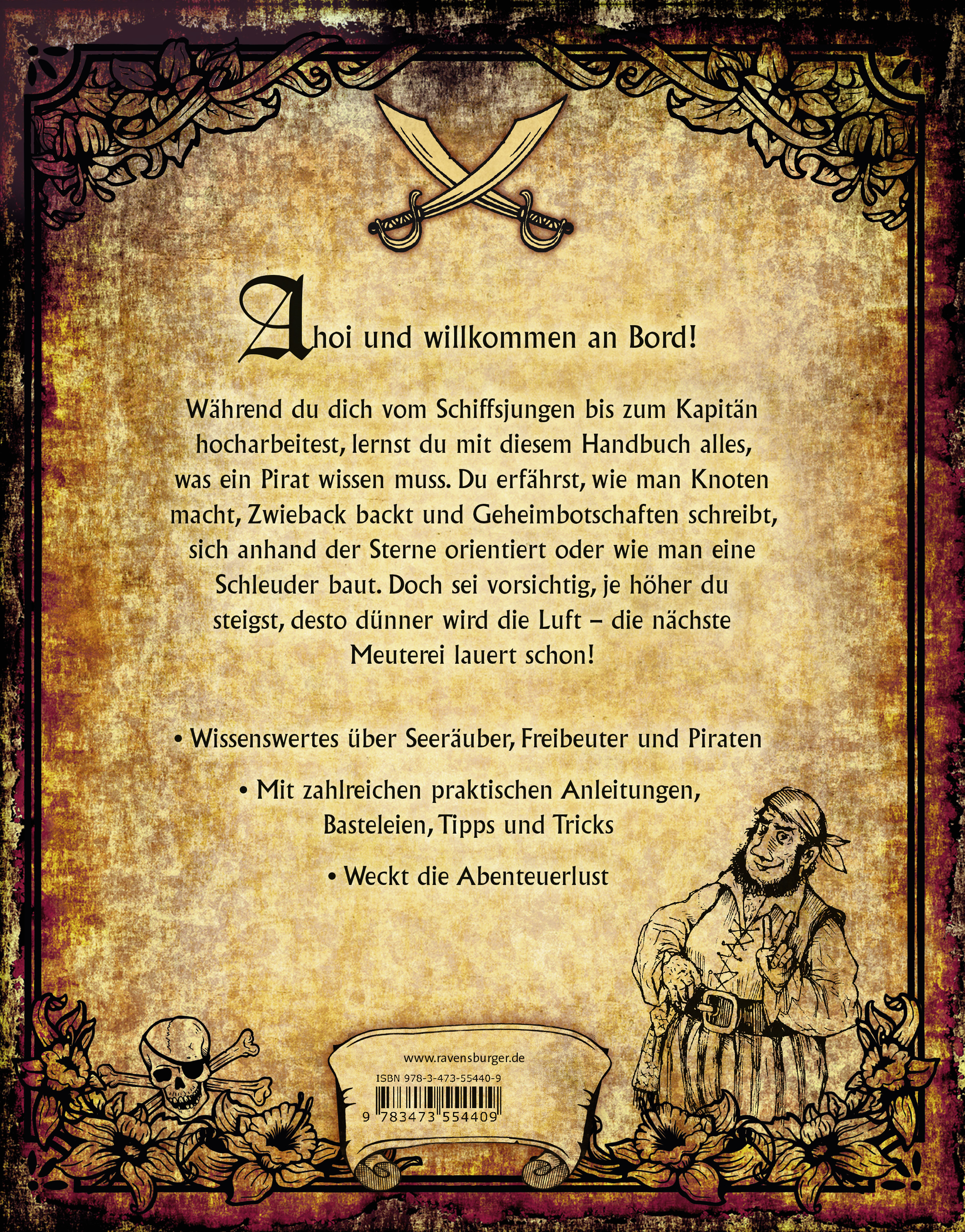 Wie werde ich ein waschechter Seeräuber? Das erfahren angehende Piraten in diesem Buch voller Abenteuer. Vom Schiffsjungen steigen sie bis zum Kapitän eines Piratenschiffes auf und landen am Ende auf einer einsamen Insel. Dabei lernen frisch gebackene Freibeuter Knoten zu machen und Zwieback zu backen, sie erfahren, wie man sich an den Sternen orientiert, einen Kompass baut und werden eingeweiht in das Geheimnis des Feuermachens. Alles was Jungs und Mädchen auf hoher See und auch an Land wissen müssen!