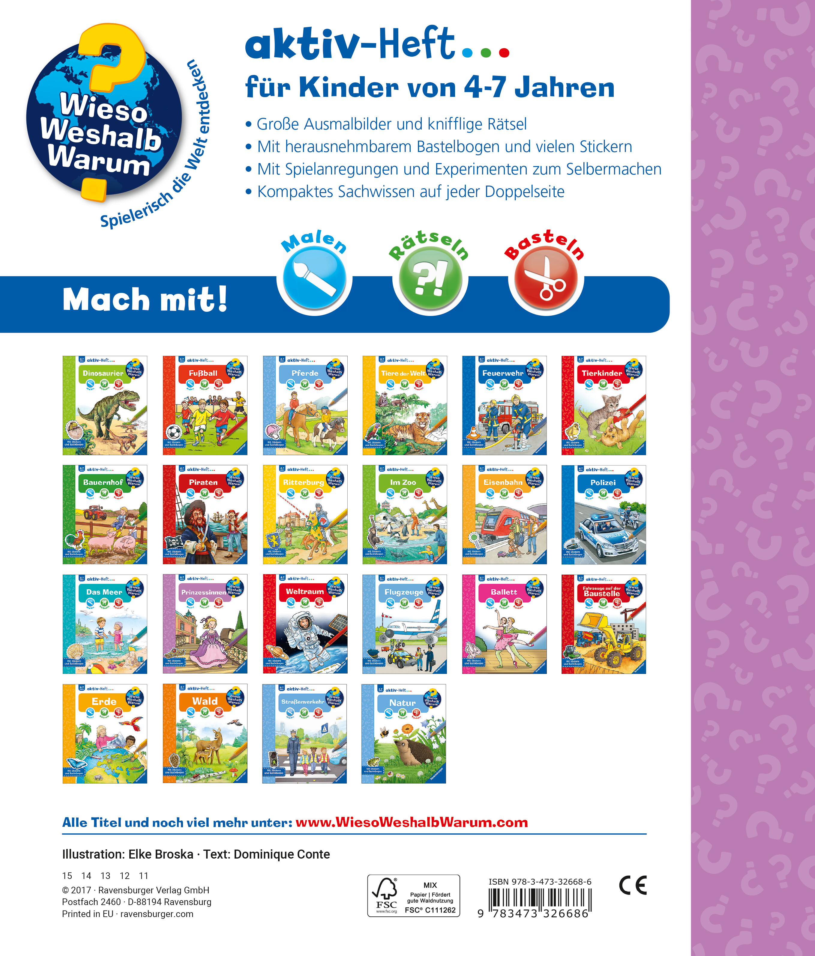 Mit den Wieso Weshalb? Warum? aktiv-Heften erschließen Kinder sich ihre Lieblingsthemen selbstständig. Große Bilder laden zum Ausmalen ein. Kurze, kindergerechte Texte vermitteln Sachwissen, das durch abwechslungsreiche Rätsel auf spielerische Weise vertieft wird. Einfache Experimente und vielfältige Spielanregungen sorgen für viel Spaß. Darüber hinaus laden Bastelideen und Sticker Kinder dazu ein, selbst kreativ zu werden.