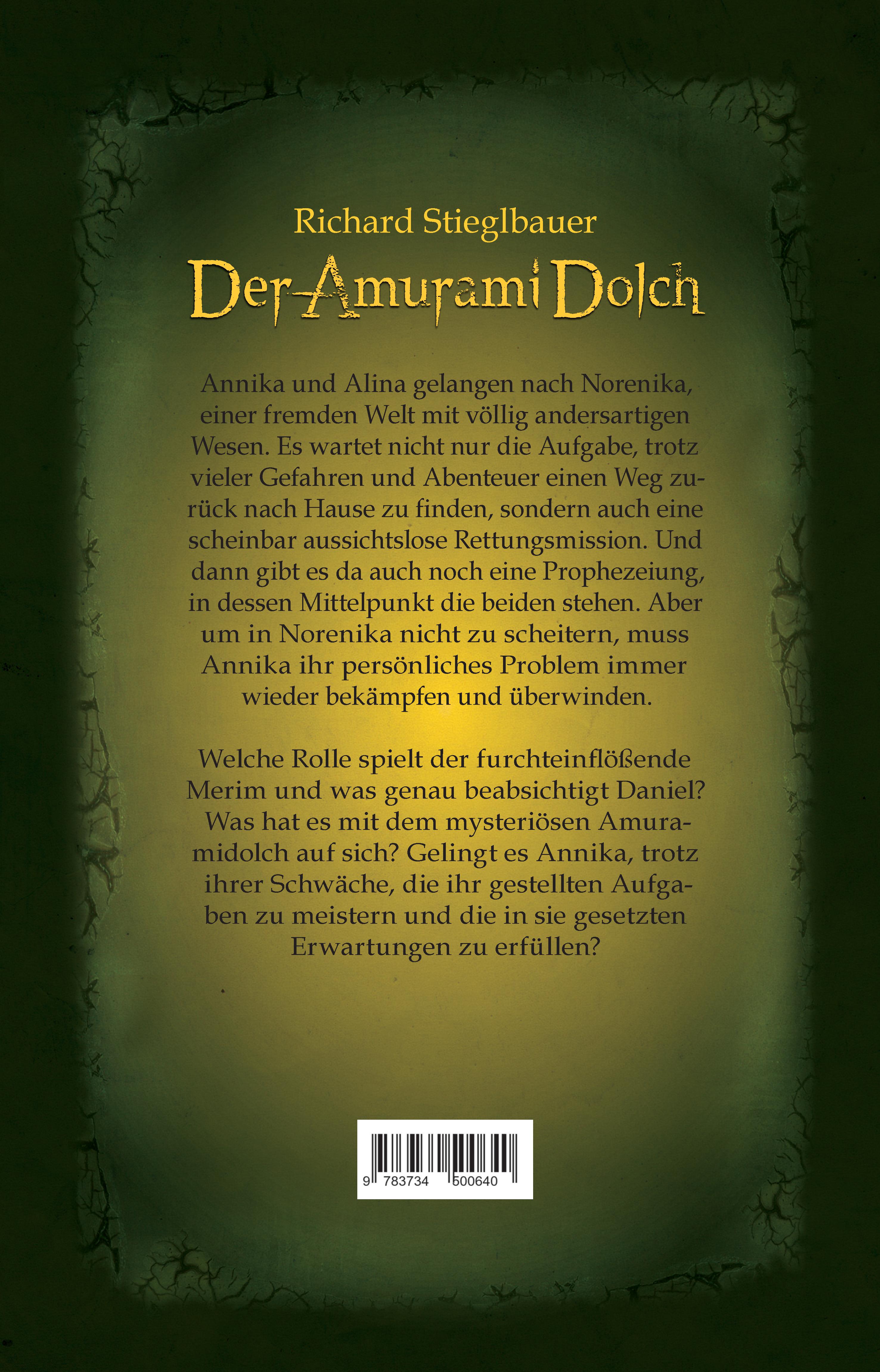 Annika und Alina gelangen nach Norenika, einer fremden Welt mit völlig andersartigen Wesen. Es wartet nicht nur die Aufgabe, trotz vieler Gefahren und Abenteuer einen Weg zurück nach Hause zu finden, sondern auch eine scheinbar aussichtslose Rettungsmission. Und dann gibt es da auch noch eine Prophezeiung, in dessen Mittelpunkt die beiden stehen. Aber um in Norenika nicht zu scheitern, muss Annika ihr persönliches Problem immer wieder bekämpfen und überwinden. Welche Rolle spielt der furchteinflößende Merim und was genau beabsichtigt Daniel? Was hat es mit dem mysteriösen Amuramidolch auf sich? Gelingt es Annika, trotz ihrer Schwäche, die ihr gestellten Aufgaben zu meistern und die in sie gesetzten Erwartungen zu erfüllen?