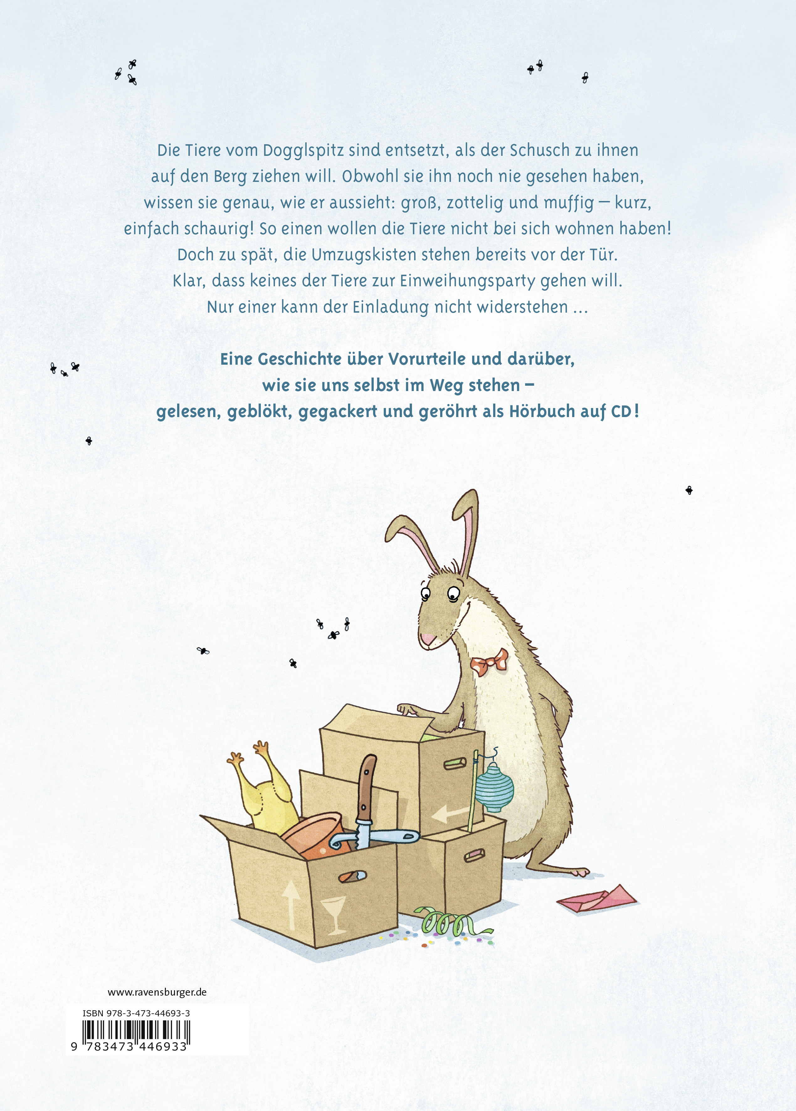 Die Tiere auf dem Dogglspitz sind entsetzt, als sie erfahren, dass der Schusch in ihre Nachbarschaft zieht. Während sie noch überlegen, wie sie das am besten verhindern, stehen schon die ersten Umzugskisten vor der Tür. Und dann bekommt auch noch jeder eine Einladung zu seiner Einweihungsparty. Klar, dass niemand hingehen will. Nur einer kann nicht widerstehen …