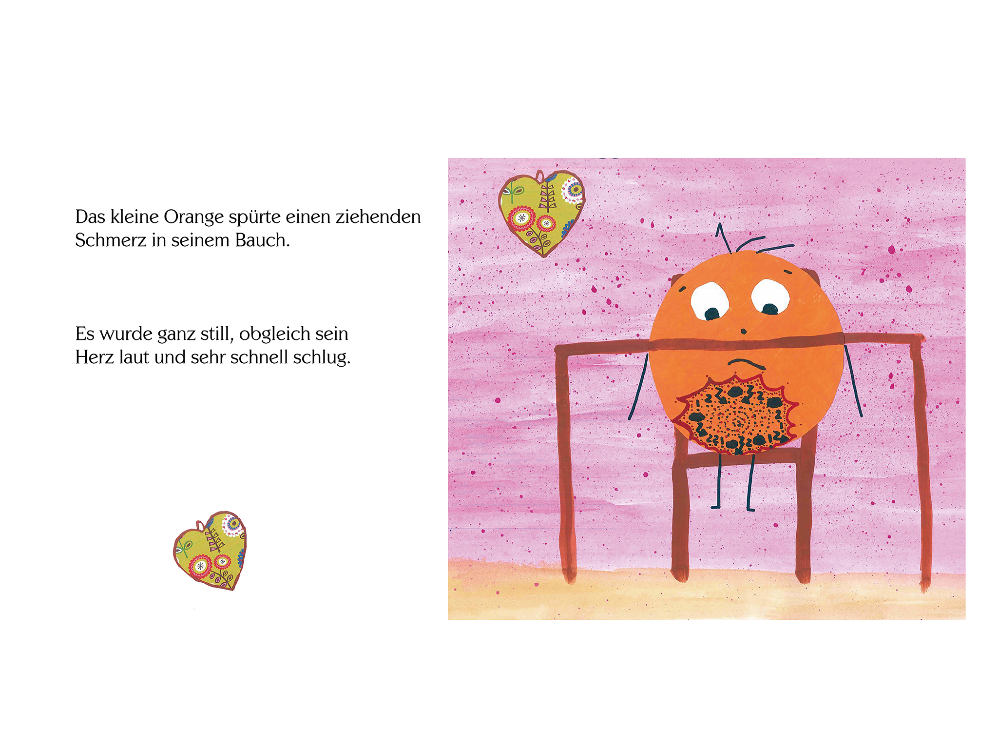 „Die Sehnsucht des kleinen Orange“ von Judith Zacharias-Hellwig greift das Thema Trennung aus der Sicht eines kleinen Kindes auf. In kindlich-plakativen Illustrationen wird eine Vater-Mutter-Kind-Situation abgebildet, wie sie häufig vorkommt: Vater und Mutter trennen sich, das Kind muss sich mit der neuen Situation auseinandersetzen.