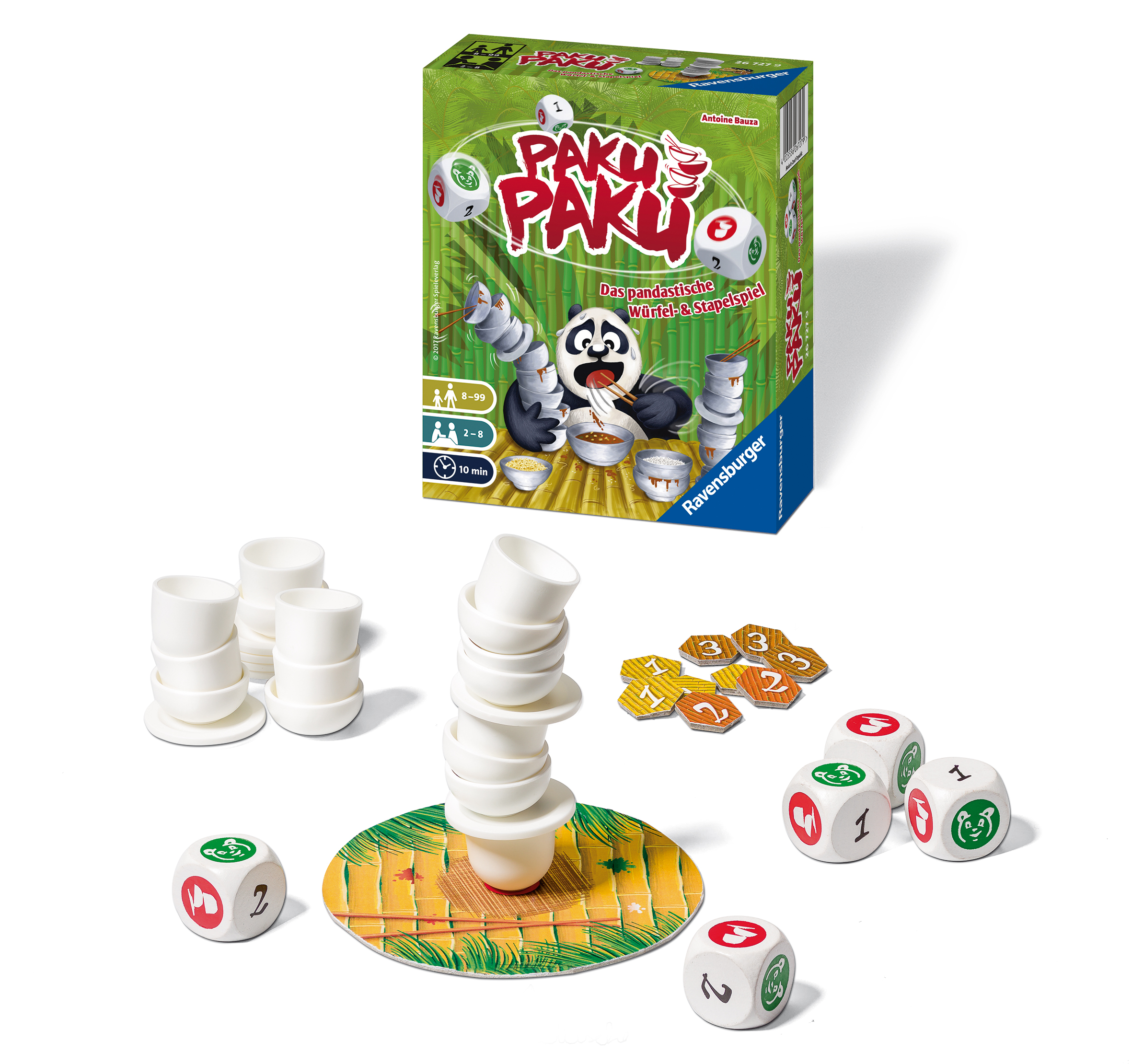 Wer türmt Tassen und Teller in wacklige Höhen? Wer kommt ins Schwitzen, wenn ihm seine Mitspieler flink die Würfel zuschieben? Und wer behält die ruhigsten Tatzen in dem rasanten Würfelspaß für 2 - 8 siegeshungrige Pandas? Diese Packung ist randvoll mit tollem 3D-Spielmaterial und pandastischem Spielspaß. PAKU PAKU Das Würfelspiel für Tellerakrobaten! Spiel-Inhalt: 24 Geschirrteile (8 Teller, 8 Schüsseln und 8 Becher), 40 Strafpunkte, 1 Tisch, 5 Würfel . Spieleranzahl: 2-8. Spieldauer: 10 Min. Spieleanleitung in deutsch.