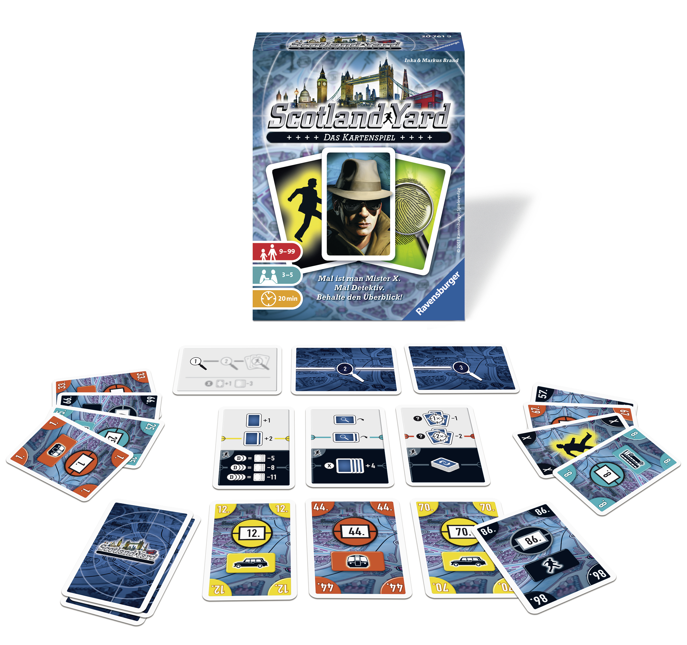Wer ist Mister X? Zufällig wird zu Spielbeginn die Mister X-Karte verteilt. Erst müssen die Detektive herausfinden, wer Mister X ist, dann müssen sie ihn schnappen. Doch dieser wird sich mit seinen mächtigen Black-Tickets wehren! Das Scotland Yard Kartenspiel: Der verdächtig gute Rollentausch! Spiel-Inhalt: 90 Spielkarten 1 Anleitung. Spieleranzahl: 3-5. Spieldauer: 20 Min. Spieleanleitung in deutsch.
