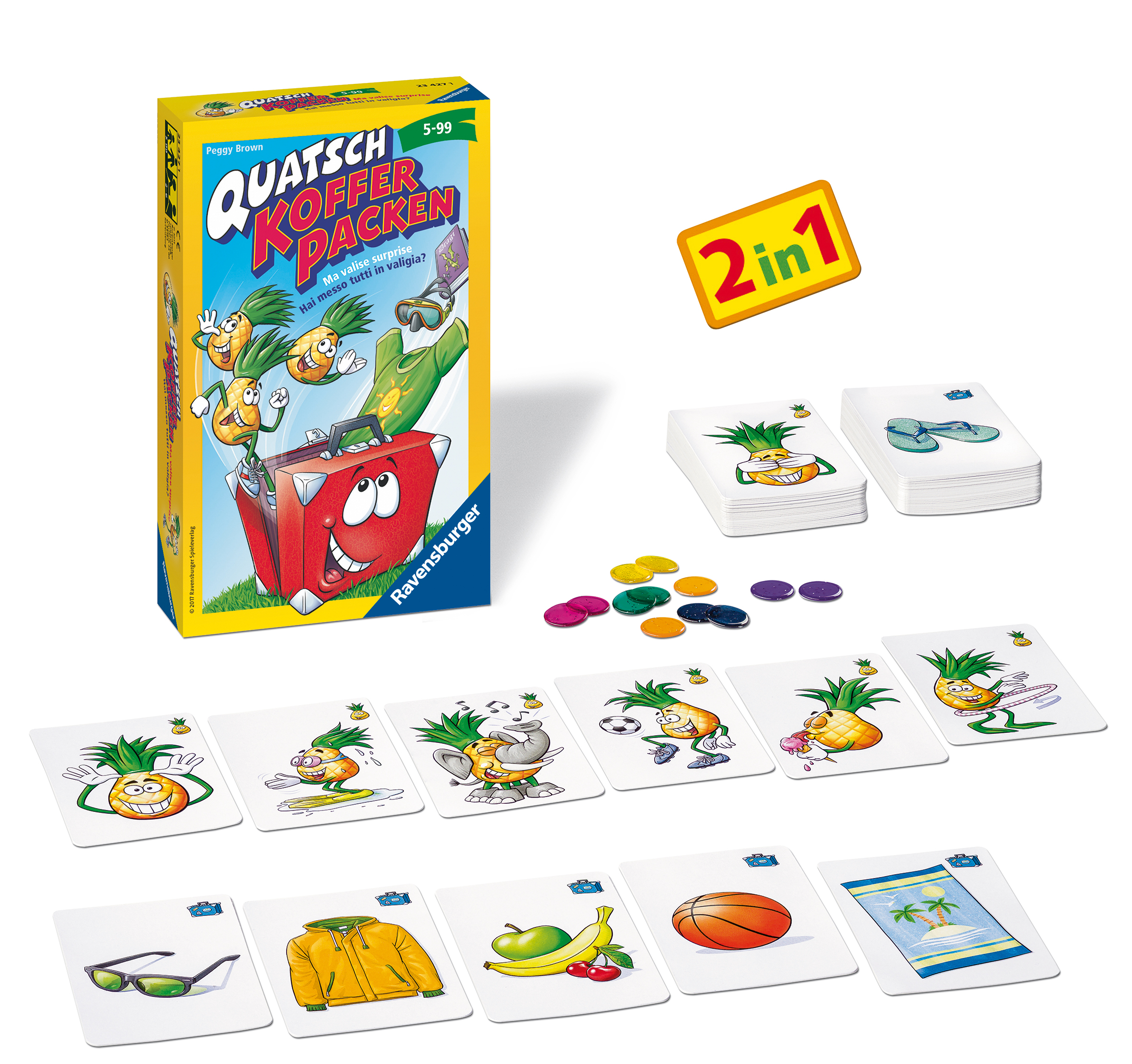 "Ich packe in meinen Koffer ..." und die Reihe der gemerkten Dinge wird immer länger. Jetzt zwei Spiele in einem: klassisch mit Reisegepäck oder noch witziger mit verrückten Grimassen und Bewegungen! Der klassiker jetzt noch lustiger! Spiel-Inhalt: 30 Koffer-Karten, 30 Quatschkopf-Karten, 12 Chips. Spieleranzahl: 2-6. Spieldauer: 10-15 Min. Spieleanleitung in deutsch, französisch, italienisch.