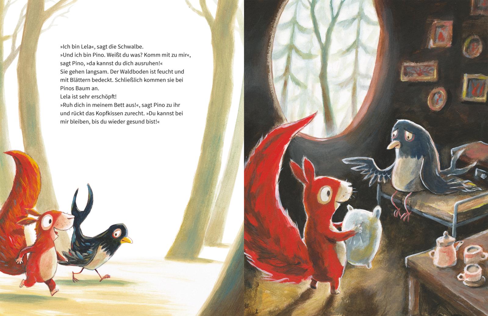 Pino Eichhörnchen ist ein toller Freund! Als er im Baum die verletzte Schwalbe Lela entdeckt, reicht er ihr ohne zu zögern die Pfote, kocht ihr Tee und bietet ihr sogar sein Bett an. Im Frühling hilft Pino ihr bei den ersten Flugversuchen. Die beiden haben eine Menge Spaß zusammen, bis Lela im Herbst am Himmel andere Schwalben sieht. Pino ahnt, dass er Abschied nehmen muss. Doch im nächsten Frühjahr erlebt er eine Überraschung: Lela ist zurück!
