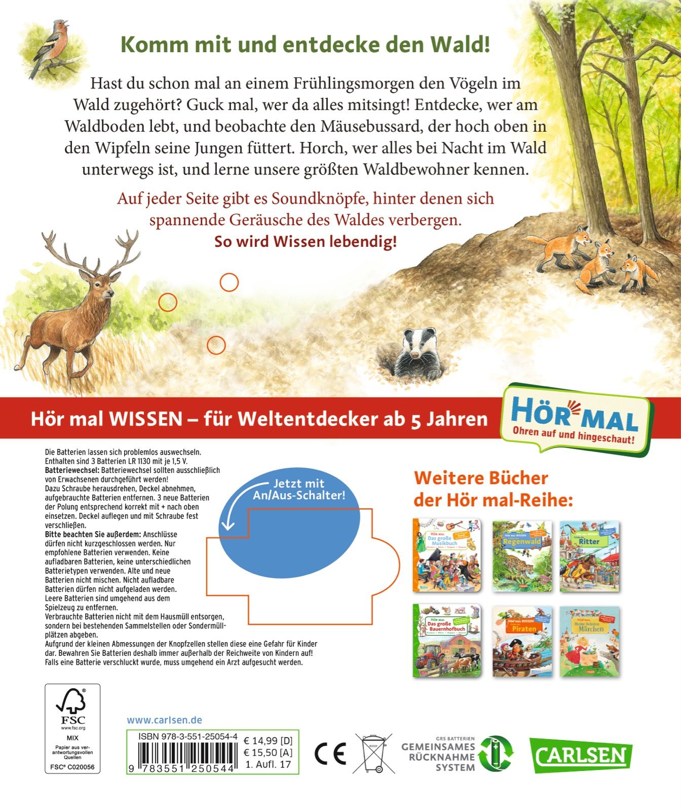 16 Waldgeräusche lassen in diesem Band der Reihe Hör mal den Lebensraum Wald für Kinder ab 5 Jahren lebendig werden. Wer stimmt alles beim Vogelkonzert am Morgen mit ein? Wer röhrt da so inbrünstig? Und wie klingt ein Waldkauz? Wer ist bei Nacht im Wald unterwegs? Welches sind die größten Waldbewohner? Wann kommen die Jungtiere zur Welt? Was machen die Tiere im Winter? Kümmert sich auch jemand um den Wald?Diese Buch ist ein spannender und sinnlicher Spaziergang durch den Wald, in dem wir diesen Lebensraum und seine Bewohner, vom Boden bis hoch hinauf in die Baumkronen, zu jeder Jahres- und Tageszeit erleben.