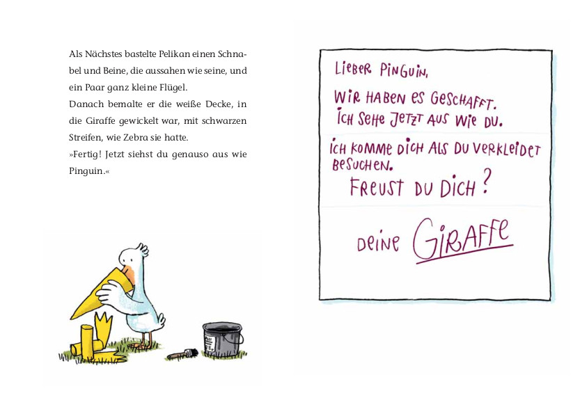 Giraffe wohnt in der afrikanischen Savanne. Ihre Tage verlaufen eintönig und sie sehnt sich nach einem Freund. Also beschließt sie, einen Brief zu schreiben: »Du sollst ihn dem ersten Tier übergeben, das dir hinter dem Horizont begegnet«, sagt sie zu Pelikan, der gerade (ebenfalls aus Langeweile) einen Postdienst eröffnet hat.Und so findet der Brief seinen Weg zu Pinguin, der weit entfernt in der Walsee lebt. Eine echte Brieffreundschaft entsteht. Eines Tages beschließt Giraffe, ihren Brieffreund zu besuchen - und zwar als Pinguin verkleidet. Gar nicht so einfach, wenn man eine Giraffe ist!Megumi Iwasa ist ein fabelhafter kleiner Briefroman gelungen, der sich perfekt zum ersten Selberlesen eignet und seit Jahren Schullektüre in Japan ist. Jörg Mühle hat ihn so illustriert, wie Giraffe und Pinguin sich das gewünscht hätten.