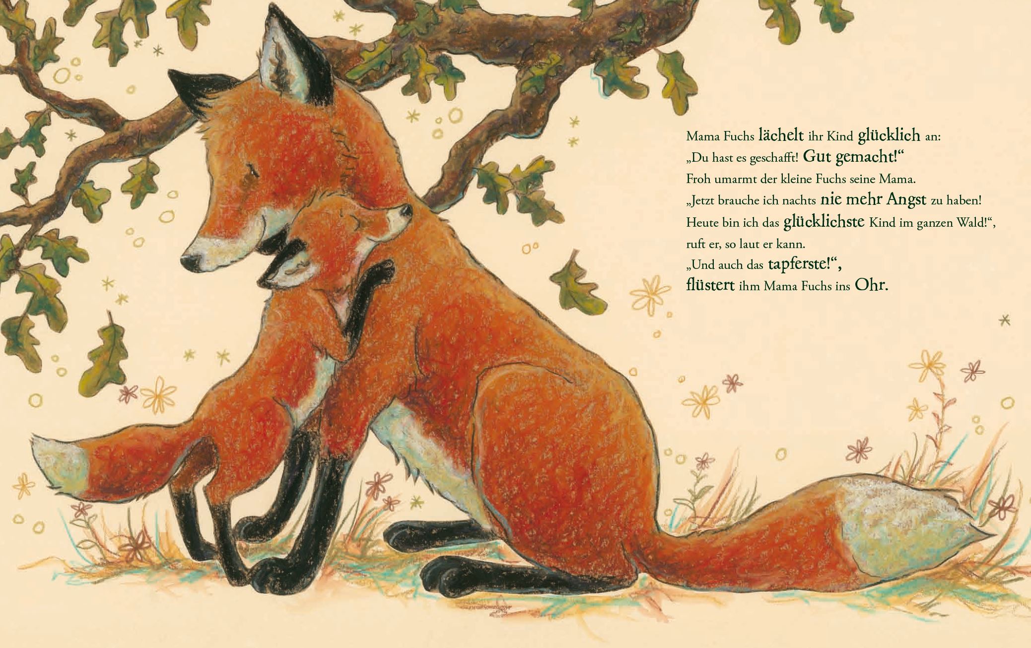 Der kleine Fuchs mag im Dunkeln nicht mehr in den Wald. Denn die alte Eiche bekommt in der Nacht ein richtiges Gruselgesicht. Dass ihn sein Freund, der freche Dachs, dafür auslacht, macht die Sache nur noch schlimmer. Zum Glück erkennt der kleine Fuchs mit Mamas Hilfe, dass Zähneklappern und Mutigsein ganz dicht beieinanderliegen und dass er es schaffen kann, Mut zu fassen und seine Angst zu überwinden.