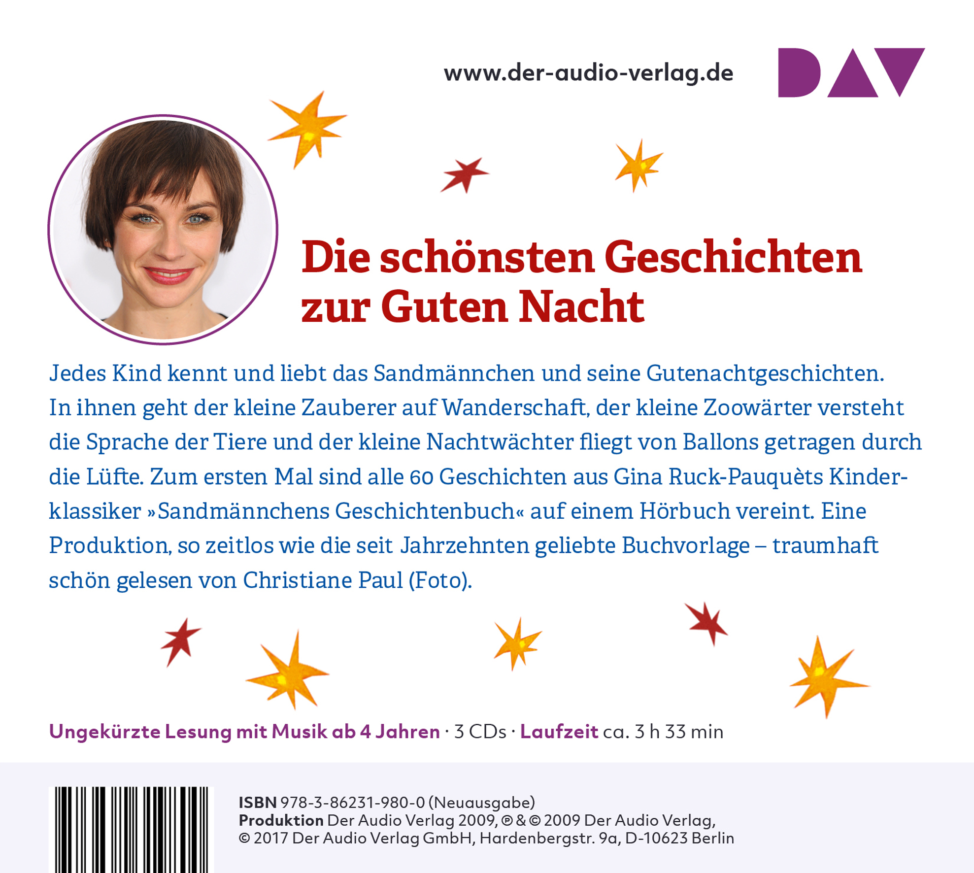 Jedes Kind kennt und liebt das Sandmännchen und seine Gutenachtgeschichten. In ihnen geht der kleine Zauberer auf Wanderschaft, der kleine Zoowärter versteht die Sprache der Tiere und der kleine Nachtwächter fliegt von Ballons getragen durch die Lüfte. Zum ersten Mal sind alle 60 Geschichten aus Gina Ruck-Pauquèts zeitlosem Klassiker »Sandmännchens Geschichtenbuch« auf einem Hörbuch vereint.Ungekürzte Lesung mit Christiane Paul3 CDs | ca. 3 h 33 min