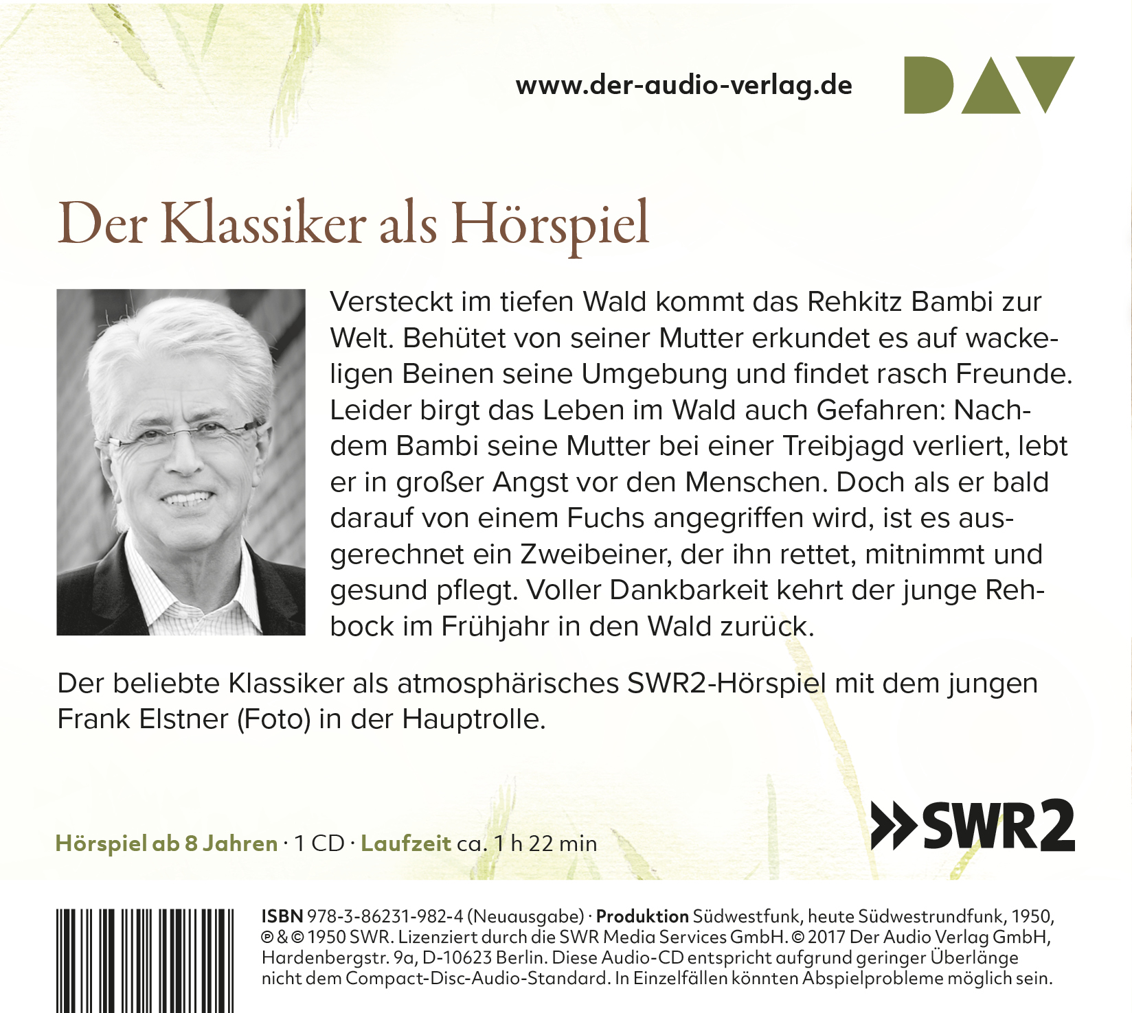 Versteckt im tiefen Wald kommt das Rehkitz Bambi zur Welt. Behütet von seiner Mutter erkundet es auf wackeligen Beinen seine Umgebung und findet rasch Freunde. Leider birgt das Leben im Wald auch Gefahren: Nachdem Bambi seine Mutter bei einer Treibjagd verliert, lebt er in großer Angst vor den Menschen. Doch als er bald darauf von einem Fuchs angegriffen wird, ist es ausgerechnet ein Zweibeiner, der ihn rettet, mitnimmt und gesund pflegt. Voller Dankbarkeit kehrt der junge Rehbock im Frühjahr in den Wald zurück. Der beliebte Klassiker als atmosphärisches SWR2-Hörspiel mit dem jungen Frank Elstner in der Hauptrolle.Hörspiel mit Frank Elstner, Joost Siedhoff1 CD | ca. 1 h 22 min