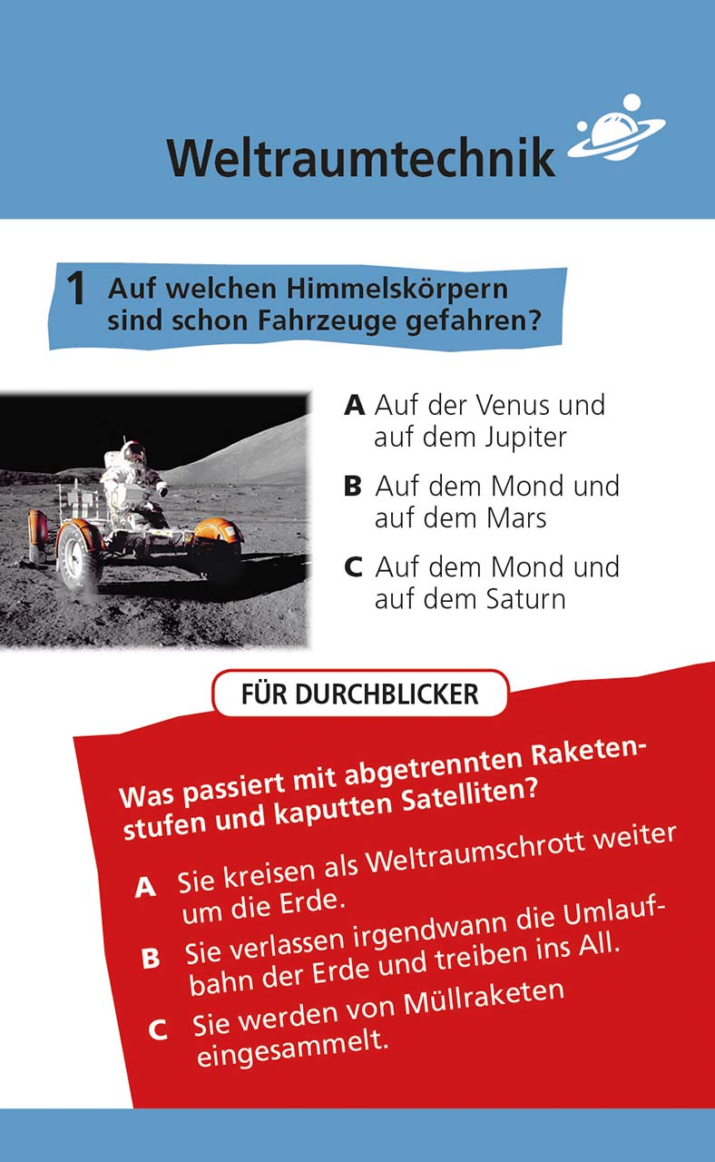 | Schlagworte | Fragen und Antworten • Planeten • Quizblock • Quiz f. Kinder/Jugendliche • Raten • Rätseln • Raumfahrt • Spiel • Sterne • Weltraum • Weltraum; Kindersachbuch/Jugendsachbuch • Wissen |