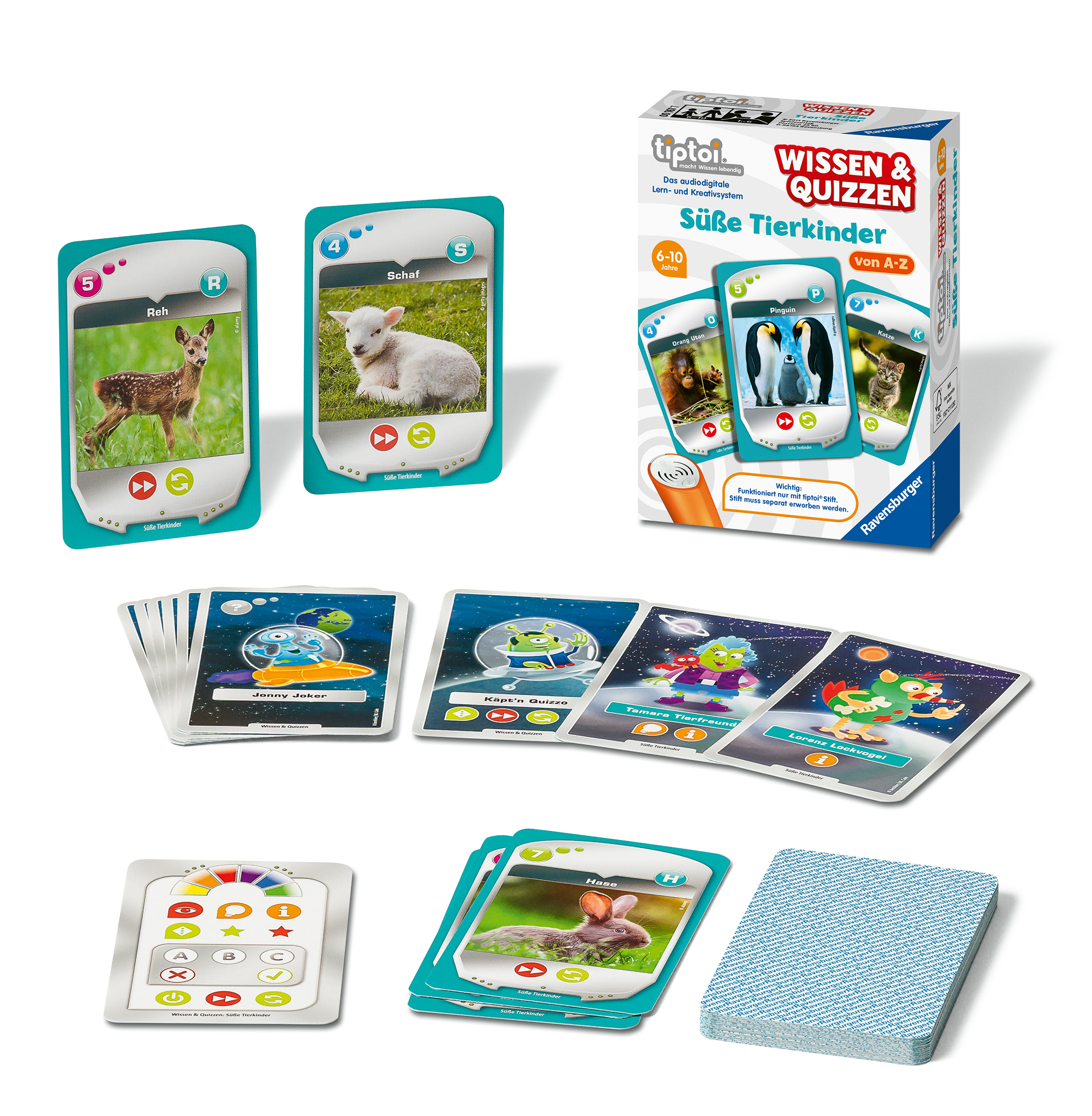 Im diesem spannenden Wissens-Quiz-Spiel erfährt man beim Entdecken alles, was es über die süßen Tierkinder von A bis Z zu wissen gibt. Danach kann im Quiz das Wissen unter Beweis gestellt werden. Ob allein oder gemeinsam, tiptoi® stellt verschiedene Fragen zu den Tieren. Dabei muss bei manchen Fragen herausgefunden werden, ob die Aussage stimmt oder welche der drei Antworten die richtige ist. Manchmal müssen auch die passenden Tiere zur Frage gefunden werden. Das Spiel "Süße Tierkinder" kann mit allen anderen Wissen & Quizzen Spielen von tiptoi® kombiniert werden. Neben dem Lexikonwissen und Quizspiel ist ein Kartenspiel mit Bewegung für zwei bis sechs Spieler im Spiel dabei.