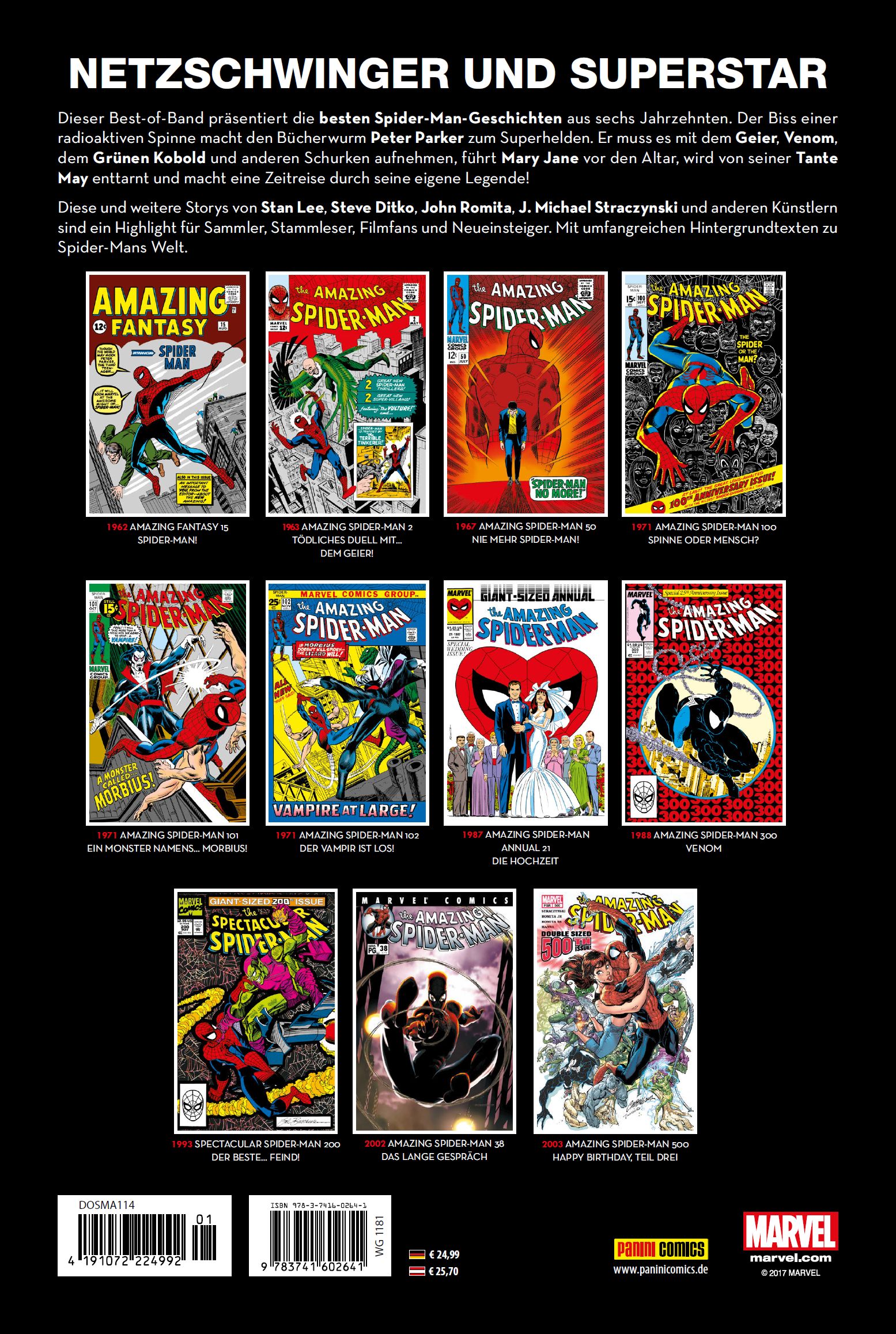 WILLKOMMEN IM NETZ VON SPIDER-MAN von Christian EndresSpider-Man Peter Parker ist einer der beliebtesten Superhelden aller Zeiten, dessen Popularität bis weit über die Grenzen der Marvel-Comics hinausreicht. Dieser Best-of-Band, den es in der vorliegenden Zusammenstellung nur auf Deutsch gibt, präsentiert einige der besten Spidey-Abenteuer, die jemals geschrieben und gezeichnet wurden. Jede Geschichte dieser Anthologie stellt ein Highlight des grafi schen Erzählens und einen Meilenstein der Spider-Man-Historie dar - viele der folgenden Storys sind sogar ein echtes Stück Comic-Geschichte! Es warten klassische, zeitlos packende Episoden aus den prägenden 60ern und 70ern, die den Grundstein für Spider-Mans andauernden Erfolg legten, intensive Meisterwerke aus den revolutionären 80ern sowie einige der größten Storys aus den aufregenden Epochen vor und nach dem Jahrtausendwechsel. Jedes Kapitel steht für eine Superhelden-Seifenoper, die seit über einem halben Jahrhundert denkwürdige Schlachten gegen Schurken, ganz besondere Augenblicke, ergreifende Tragödien, bittere Rückschläge und wunderbare Triumphe generiert.[...]