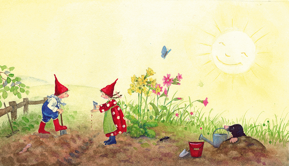 Im Garten gibt es viel zu tun: Pelle gräbt die Erde um, Pippa sät die Körnchen ein und wartet auf den Sonnenschein.