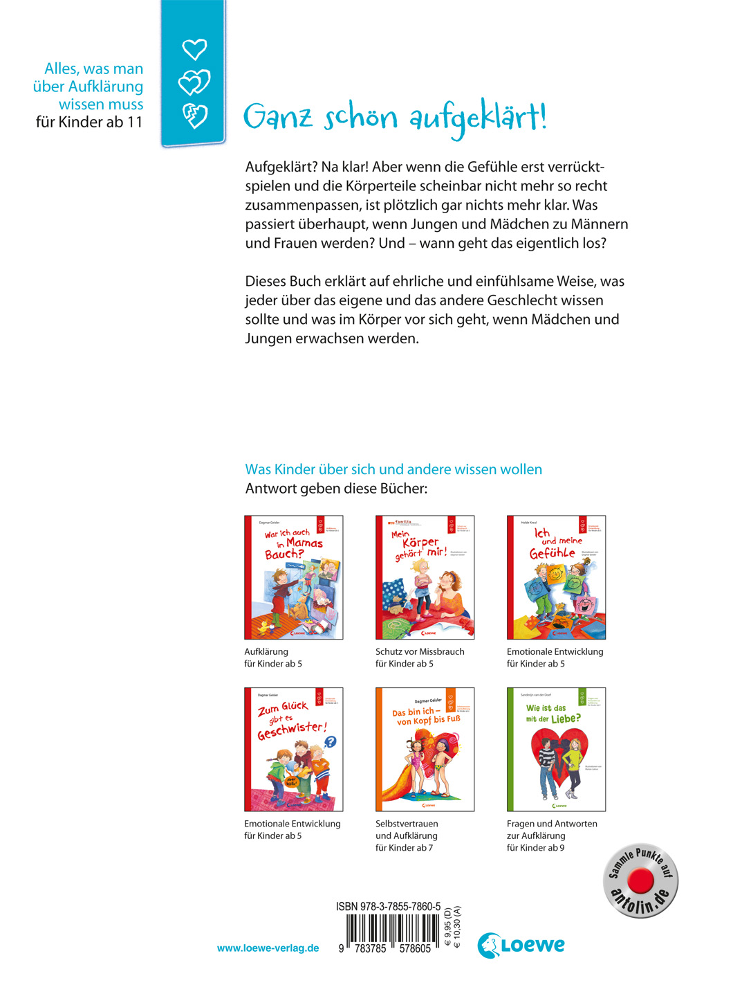 | Schlagworte | Antolin (5. Klasse) • Aufklärungsbuch ab 11 • Aufklärungsbuch für Kinder • Aufklärung Sexualität • Aufklärung (Sexualität) / Sexualaufklärung; Kindersachbuch/Jugendsachbuch • Aufklärungsratgeber • emotionale Entwicklung für Kinder • Familie Weißbescheid • In der Pubertät • Kinder 10-11 • Kinder/Jugendliche: Persönliche und soziale Themen • Kinder- und Jugendliteratur • Konstantin Wagner Familie Weißbescheid • Pubertät Jungen Mädchen • Ratgeber für Eltern • Sexualität erklären • Teenager Pubertät |