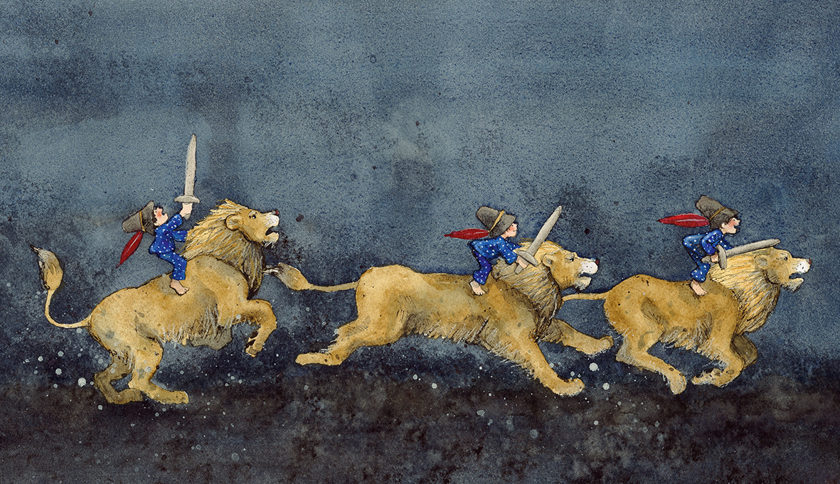 Abends kuschelt sich Magnus ins Bett. Den Löwen hat er im Arm. Da hört er ein Geräusch. Äste knacken. »Er ist hier«, flüstert Magnus dem Löwen zu. »Ich hab Angst. Hörst du ihn?« »Sei kein Hasenfuß«, sagt der Nachtlöwe. »Du bist doch ein Ritter. Setz deinen Hut auf, nimm dein Schwert und schwing dich auf meinen Rücken.« Der Nachtlöwe brüllt, oh, wie er brüllt! Sie stürmen durch den Wald, dem Räuber hinterher. »Ich bin der Ritter mit dem Schwert! Komm, kämpf mit mir, wenn du dich traust!«, schreit Magnus. Wild, verwegen und furchterregend. »Was ist denn hier für ein Krach?« Da ist Papa. »Keine Sorge«, sagt Magnus. »Sag Mama, wir haben den Räuber weggejagt. Ihr könnt jetzt schlafen gehen.«