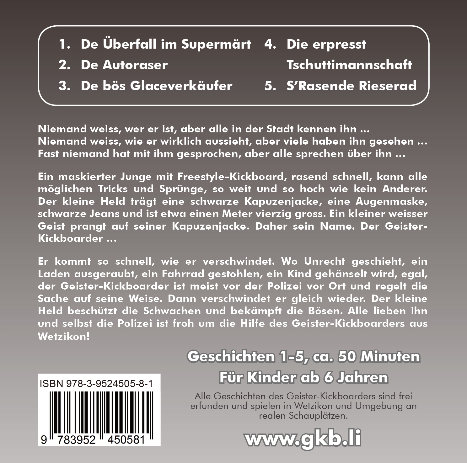 Er kommt so schnell, wie er verschwindet. Wo Unrecht geschieht, ein Laden ausgeraubt, ein Fahrrad gestohlen, ein Kind gehänselt wird, egal, der Geister-Kickboarder ist meist vor der Polizei vor Ort und regelt die Sache auf seine Weise. Dann verschwindet er gleich wieder. Der kleine Held beschützt die Schwachen und bekämpft die Bösen. Alle lieben ihn und selbst die Polizei ist froh um die Hilfe des Geister-Kickboarders aus Wetzikon!