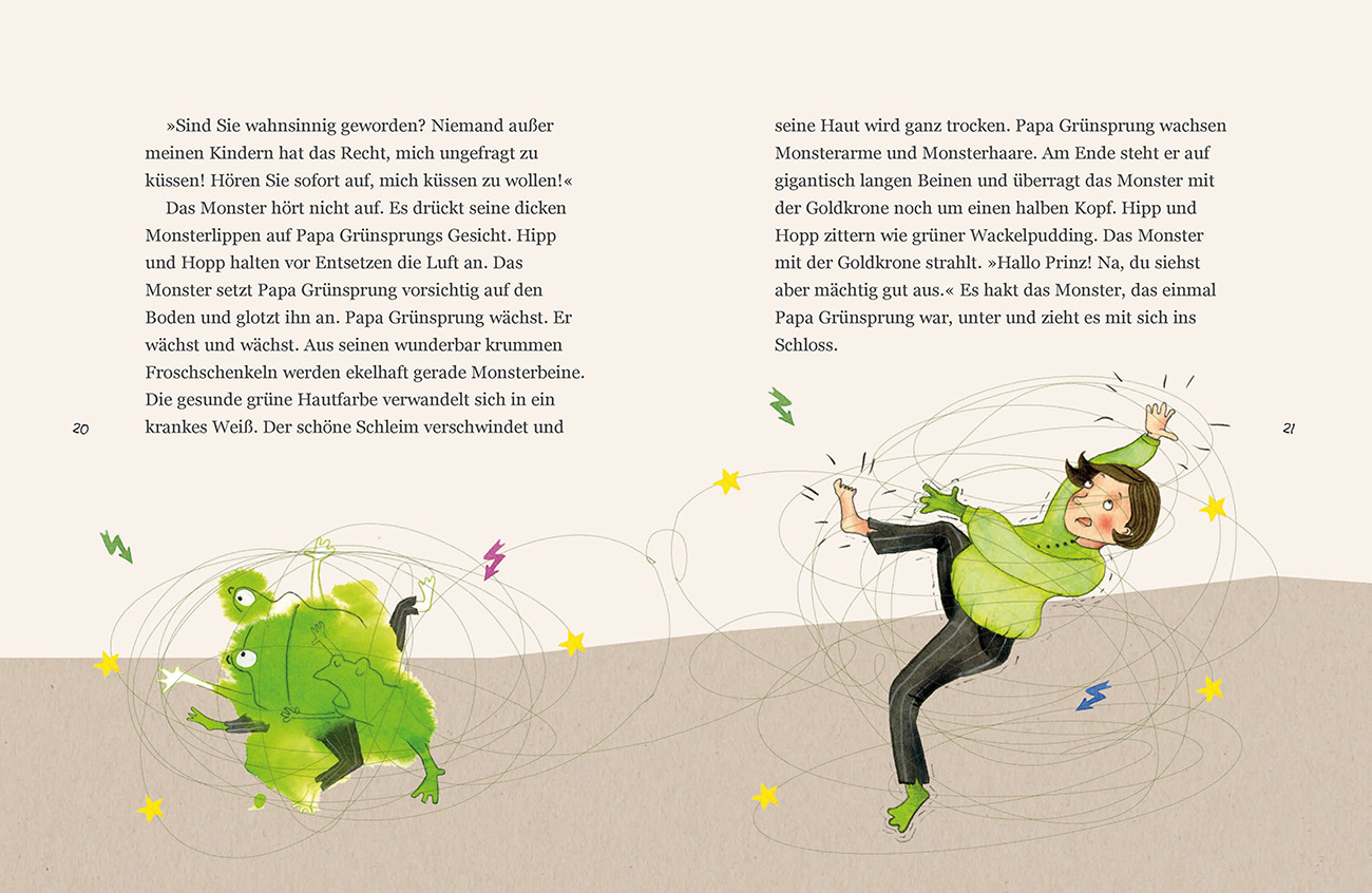 Die Kinder des Froschkönigs erzählen, wie's wirklich warEines Tages müssen die Froschkinder Hipp und Hopp mit ansehen, wie ihr Papa von einem langbeinigen, bleichen Wesen mit goldener Krone geküsst wird. Zu ihrem Entsetzen weicht Papa Grünsprung die schöne grüne Farbe aus den Froschschenkeln und ihm wachsen grässlich lange Arme und Beine! Hipp und Hopp sind verzweifelt - sie wollen ihren Papa zurückhaben! Ein großes Abenteuer beginnt ...
