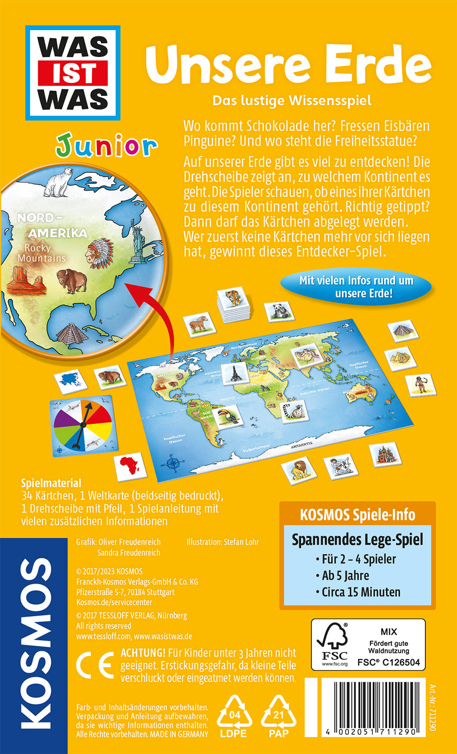 gt; Spielerisch die Welt entdecken. Das lustige Wissensspiel: Wo kommt Schokolade her? Fressen Eisbären Pinguine? Wo steht die Freiheitsstatue? Auf unserer Erde gibt es viel zu entdecken! Die Drehscheibe zeigt an, zu welchem Kontinent es geht. Die Spieler schauen, ob eines ihrer Kärtchen zu diesem Kontinent passt. Richtig getippt? Dann darf das Kärtchen abgelegt werden. Wer zuerst keine Kärtchen mehr vor sich liegen hat, gewinnt dieses spannende Spiel. Für 2 - 4 Spieler ab 5 Jahren. © 2014 Tessloff Verlag, Nürnberg. Alle Rechte vorbehalten.