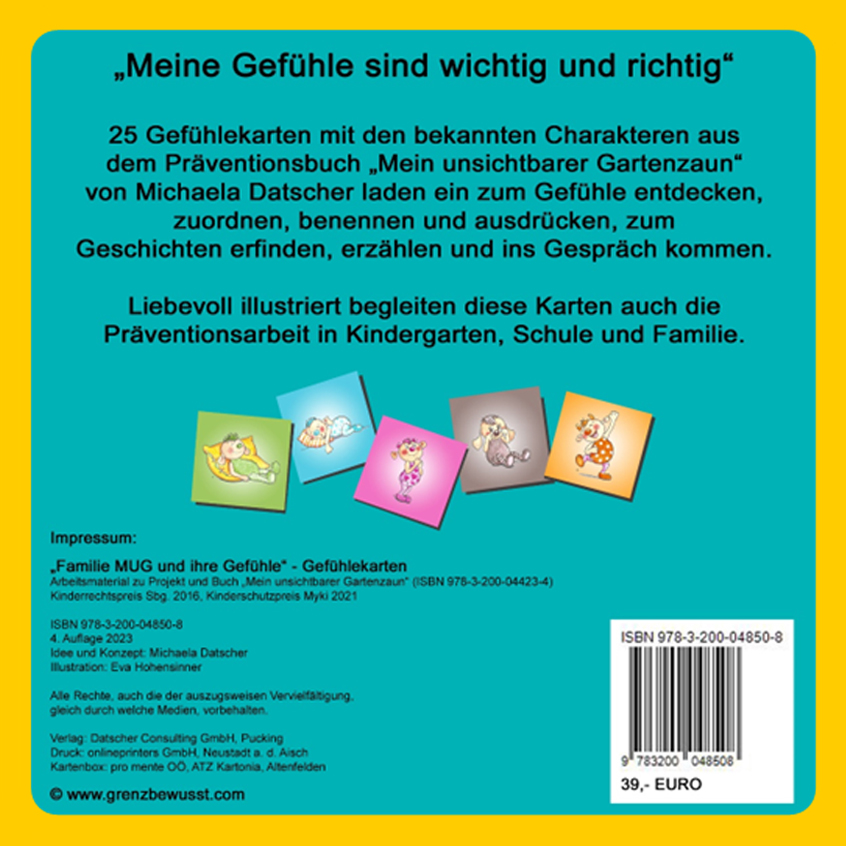25 Gefühlekartenkarten mit den bekannten Charakteren aus dem Präventionsbuch "Mein unsichtbarer Gartenzaun" (ISBN 9783200044234 - ausgezeichnet mit dem Kinderrechtspreis 2016 / Sbg.) laden ein zum Gefühle Entdecken, Zuordnen, Benennen und Ausdrücken, zum Geschichten Erfinden, Erzählen und ins Gespräch kommen.