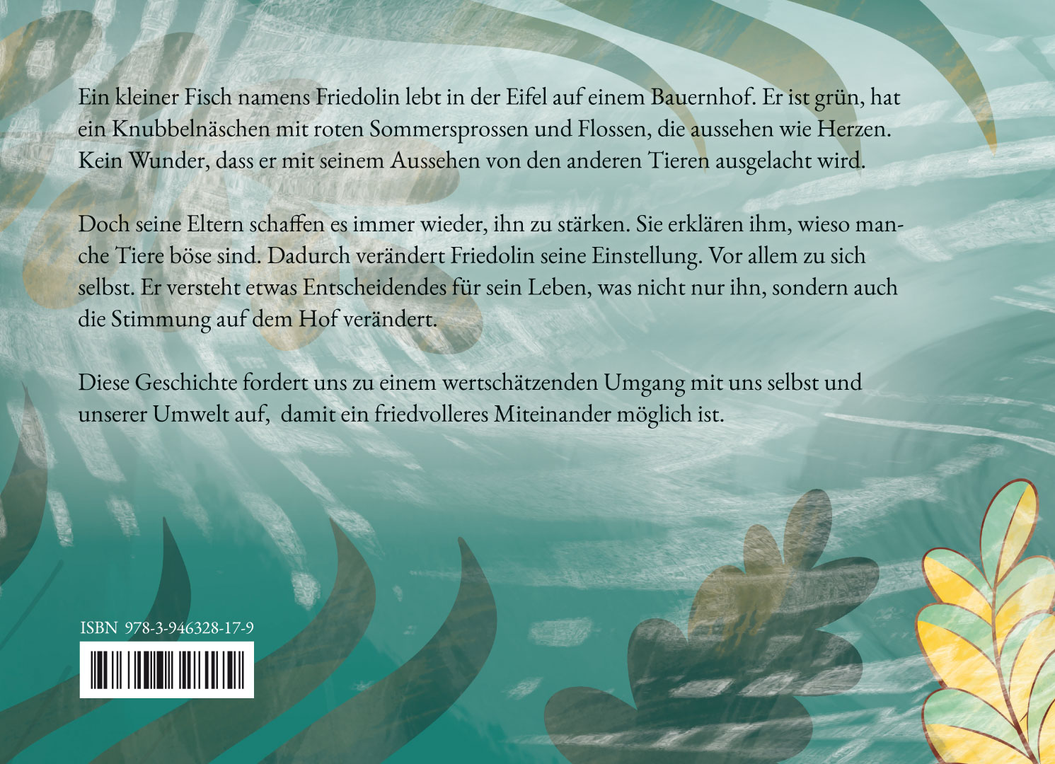 Die gefühlvoll neu illustrierte Auflage des Bestsellers von Kerstin Werner!Ein kleiner Fisch namens Friedolin lebt in der Eifel auf einem Bauernhof. Er ist grün, hat ein Knubbelnäschen mit roten Sommersprossen und Flossen, die aussehen wie Herzen. Kein Wunder, dass er mit seinem Aussehen von den anderen Tieren ausgelacht wird.Doch seine Eltern schaffen es immer wieder, ihn zu stärken. Sie erklären ihm, wieso manche Tiere böse sind. Dadurch verändert Friedolin seine Einstellung. Vor allem zu sich selbst. Er versteht etwas Entscheidendes für sein Leben, was nicht nur ihn, sondern auch die Stimmung auf dem Hof verändert.Diese Geschichte fordert uns zu einem wertschätzenden Umgang mit uns selbst und unserer Umwelt auf, damit ein friedvolleres Miteinander möglich ist.Altersempfehlung: ab 5 Jahre
