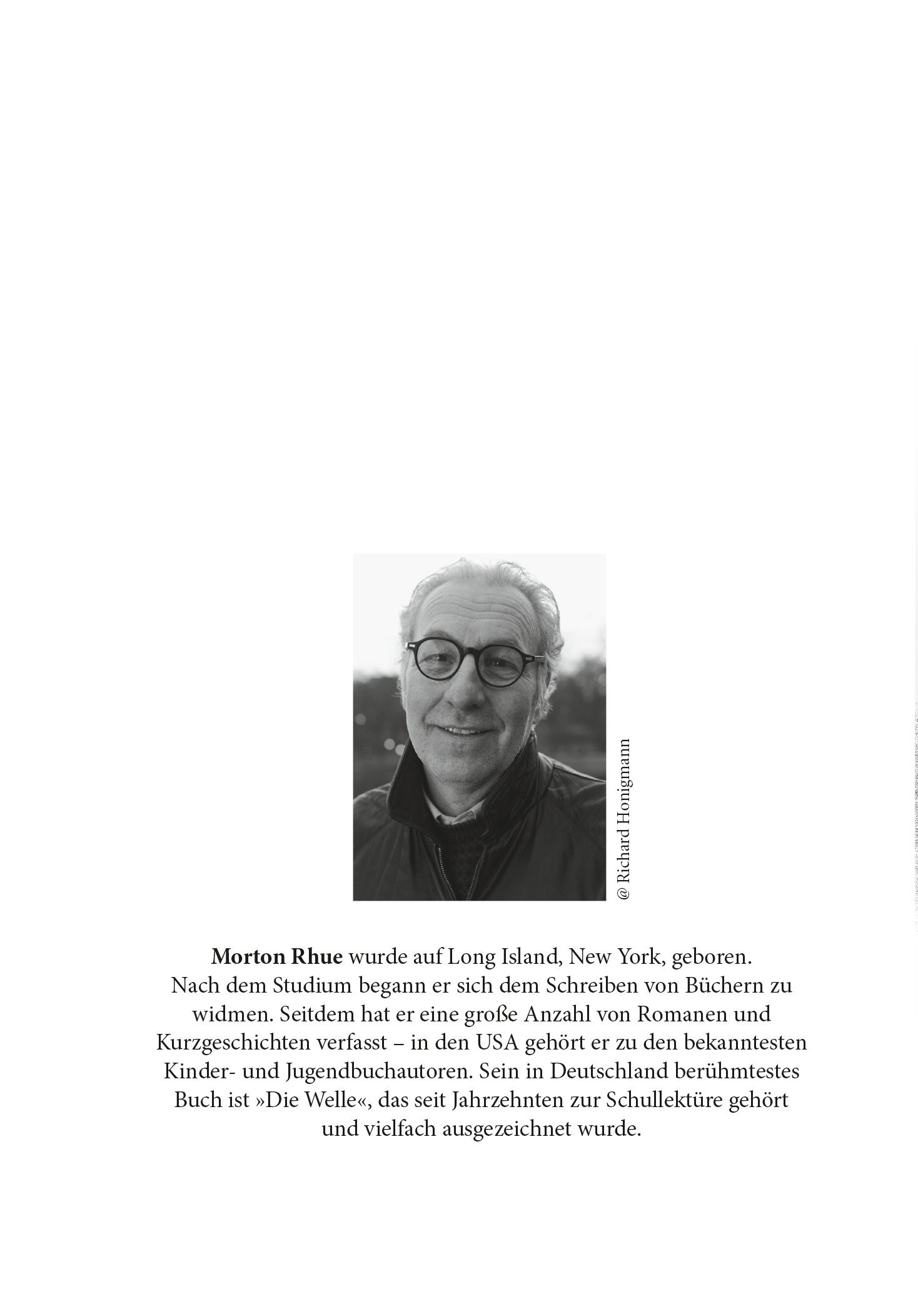 Morton Rhue, der eigentlich Todd Strasser heißt, wurde am 5. Mai 1950 auf Long Island, New York, geboren und wuchs auch dort auf. Als junger Mann reiste er durch die USA und Europa und verdiente sich sein Geld z. B. als Schiffssteward und Straßenmusiker. Nach dem Studium arbeitete er einige Jahre als Zeitungsreporter und Werbetexter. Schließlich entschloss sich Morton Rhue dazu, das Schreiben von Büchern zu seinem Hauptberuf zu machen. Seitdem hat er eine große Anzahl von Romanen und Kurzgeschichten verfasst - in Amerika gehört er zu den bekanntesten Kinder- und Jugendbuchautoren. Sein in Deutschland berühmtestes Buch ist "Die Welle", das seit Jahrzehnten zur Schullektüre gehört und das vielfach ausgezeichnet wurde. Morton Rhue lebt nach wie vor in New York. Seine Hobbys sind Angeln, Skifahren und Surfen. Über seine Bücher sagt er: "Gute Jugendliteratur soll dem Leser helfen richtige Entscheidungen zu treffen."