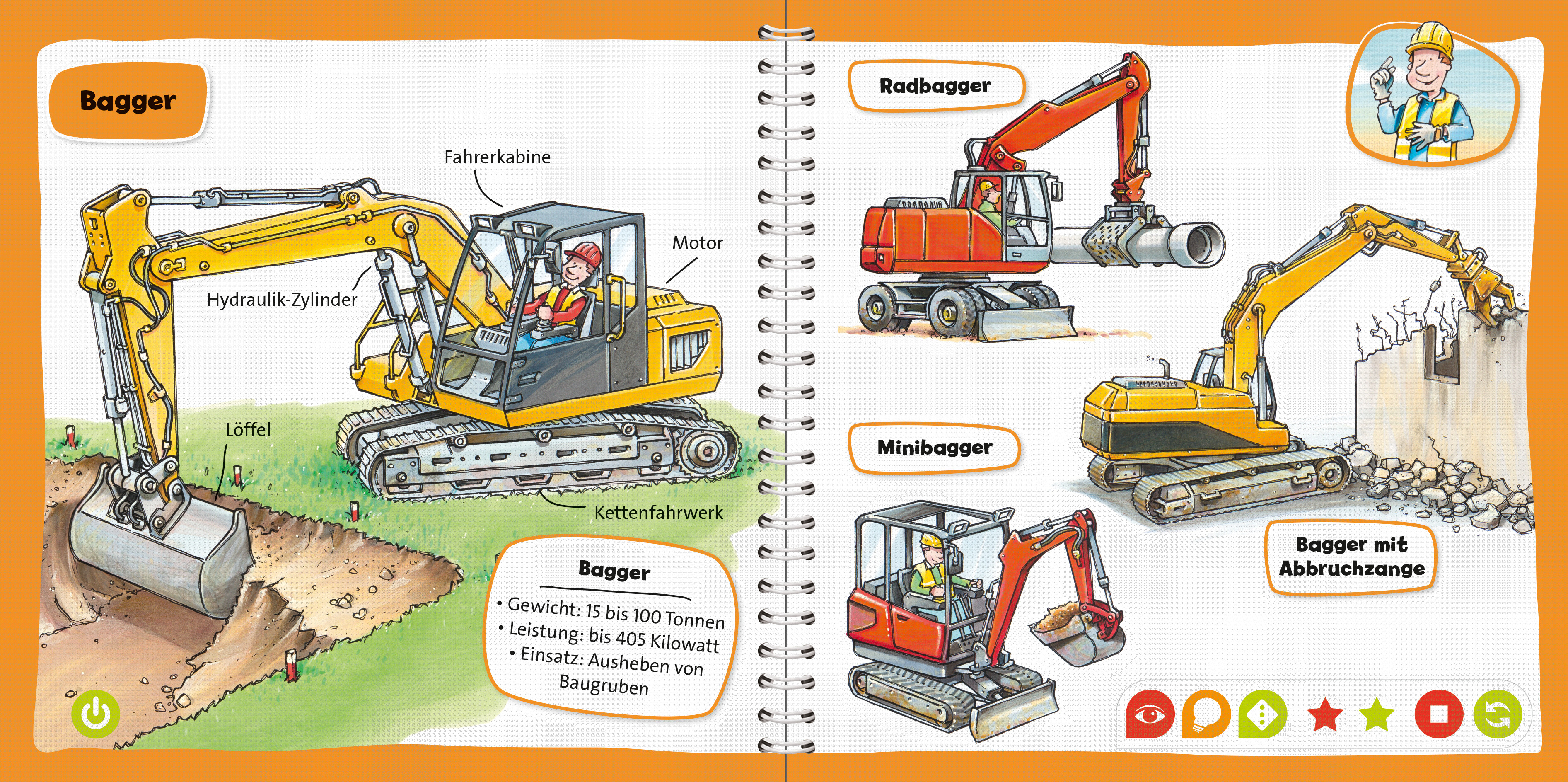 Diese und viele andere Fragen, die kleine Technikfans sich stellen, werden hier beantwortet. Detailgetreue Illustrationen, authentische Geräusche und Quizspiele lassen die Baustelle lebendig werden.